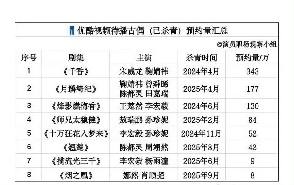 优酷、爱奇艺待播剧预约量排名鞠婧祎《千香》《来战》包揽第一
