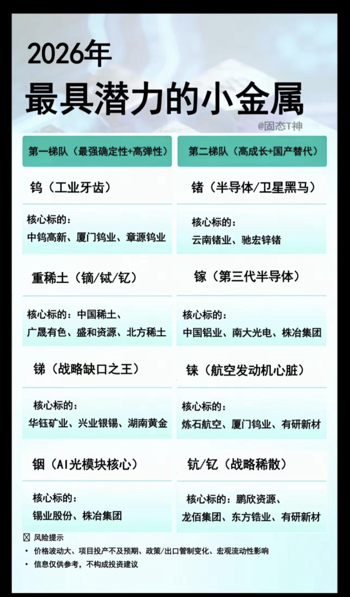 2026:最具潜力的小金属! 第一梯队:高确定性、高成长 第二梯队:高成长+国产替代 钨、锗、镓、钇、镝、铼、锑、钪 相关核心龙头股: