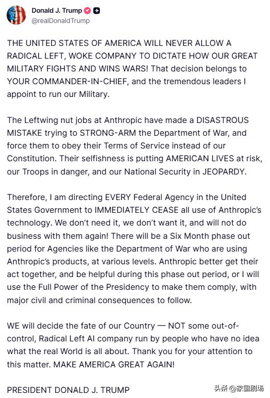 懂王:美国绝不会允许一家激进左翼、政治正确的公司,来决定我们伟大军队如何作战并赢得胜利!这一决策权属于你们的三军统帅,以及我任命的领导军队的杰出将领。 安斯派克公司的左翼极端分子犯下了灾难性错误,他们试图强迫国防部屈服于自己的服务条款,而非我们的宪法。他们的自私行为正危及美国人的生命、我军士兵的安全,以及我们的国家安全。 因此,我命令美国政府所有联邦机构立即停止使用安斯派克公司的技术。我们不需要它,也不想要它,今后不会再与他们开展业务!对于国防部等正在使用安斯派克公司产品的机构,将设置六个月的过渡期。安斯派克公司最好端正态度,在过渡期内积极配合,否则我将动用总统的全部权力强制其遵守规定,届时他们将面临严重的民事和刑事后果。 我们将决定自己国家的命运——而不是由一家脱离实际、由对现实世界一无所知的人掌控的激进左翼人工智能公司来决定。