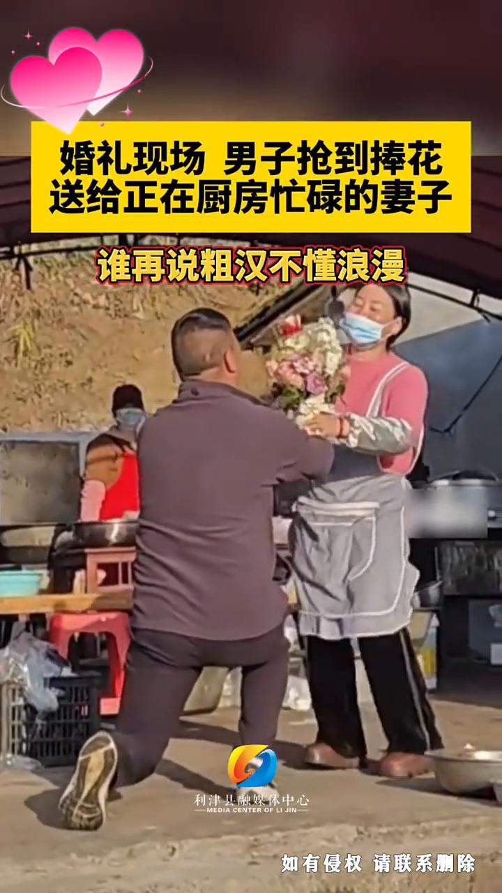 谁再说粗汉不懂浪漫。2026年2月下旬,山东东营利津县一场乡村婚礼的短视频,在社交平台悄然走红。画面里没有精致的舞台布景,没有华丽的礼服妆容,却凭着一个朴实无华的举动,戳中了无数网友的心。 婚礼现场,一位中年男子在抢捧花环节脱颖而出,他没有把花留给自己,也没有送给现场的单身亲友,而是转身快步走向后厨,把这束承载着祝福的捧花,郑重地递给了正在灶台前忙碌的妻子。 这场婚礼就办在利津县当地的乡村,按照当地的民俗,婚礼当天,亲朋好友都会赶来帮忙,从布置场地到准备宴席,大家各司其职,热闹又温馨。拍摄者李女士是婚礼现场的宾客,她全程见证了这个温暖瞬间的发生。 据李女士介绍,送花的男子和他的妻子是土生土长的利津人,两人已经结婚二十多年,携手走过了大半辈子,他们的孩子如今已经20岁左右,早已褪去了孩童的稚气,成了能够独当一面的成年人。 婚礼进行到后半程,到了新娘抛捧花的环节,这是婚礼上最具期待感的环节之一,按照传统,抢到捧花的人会收获新人的祝福,寓意着下一个收获幸福。 当时主持人一声令下,新娘将手中的捧花高高抛向空中,现场的宾客瞬间沸腾起来,年轻人纷纷踮起脚尖、伸出双手,想要抢到这份好运。地上散落着新人刚派发的红包,不少人忙着弯腰捡拾,唯独这位中年男子,没有理会脚下的红包,只是站在人群后方,目光紧紧跟着空中的捧花。 当捧花划过一道弧线落下时,这位男子突然迈开步子,一个箭步冲上前,纵身跃起,稳稳地将捧花抓在了手里。周围响起一阵欢呼声,大家都以为他会像往常一样,拿着捧花向新人道贺,或者在镜头前摆个姿势留念。可接下来的举动,让现场所有人都愣住了。 他先是下意识地整理了一下自己的衣角,仿佛要以最得体的样子去见重要的人,然后捧着花,没有丝毫犹豫,径直朝着后厨的方向走去。 后厨的场景和前院的热闹截然不同,这里弥漫着饭菜的香气,灶台上火光熊熊,几位帮忙的乡亲正忙着切菜、颠勺、摆盘。 男子的妻子就站在灶台边,身上穿着粉色的上衣,外面套着一件灰色的围裙,脸上还戴着一个口罩,只露出一双忙碌的眼睛。 她的手上沾着些许水渍和油污,正拿着锅铲翻炒着锅里的菜肴,听到前院的欢呼声,也只是抬头匆匆望了一眼,又低头继续忙活,显然是想尽快把可口的饭菜端给宾客。 男子走到妻子身边,没有大声喧哗,只是轻轻喊了一声,正在忙碌的妻子闻声回头,看到丈夫捧着花站在自己面前,瞬间愣住了,手里的锅铲也停在了半空中。 紧接着,男子做出了一个让全场动容的举动,他单膝跪地,双手捧着那束娇艳的捧花,递到了妻子面前。突如其来的浪漫,让妻子瞬间红了脸,她有些手足无措地放下锅铲,摘下口罩,眼里满是惊喜和羞涩,嘴角忍不住上扬,却又不好意思地低下了头。 周围帮忙的乡亲们看到这一幕,纷纷停下手中的活计,鼓掌起哄,掌声和笑声把后厨的温度抬得更高。妻子接过捧花,紧紧抱在怀里,脸上的笑容怎么也藏不住,那是被爱包围的幸福模样。 男子站起身,没有多说什么,只是对着妻子笑了笑,又拍了拍她的肩膀,仿佛在说“辛苦你了”,然后便转身回到前院,继续帮忙招呼宾客,而妻子则抱着捧花,又重新拿起锅铲,只是这一次,她的动作里多了几分轻快。 李女士用手机记录下了这完整的一幕,她表示,当时自己也被深深打动了。这对夫妻平日里就是村里出了名的恩爱,二十多年来,他们一起种地、一起操持家务,养育孩子,日子过得平淡却踏实。 丈夫是个不善言辞的人,平日里很少说情话,也不会做什么浪漫的举动,却总在细节里默默守护着妻子。家里的重活累活他总是抢着干,妻子忙碌的时候,他总会默默搭把手,这份藏在柴米油盐里的爱,早已融入了他们的日常生活。 这条视频被利津县融媒体中心发布后,迅速引发了全网关注。网友们纷纷留言,有人说“这才是爱情最美的样子”,有人感慨“浪漫从来都与年龄无关”。 在利津县,这样朴实的爱情并不少见,近年来,当地大力推进婚俗改革,倡导简约婚礼、文明婚恋,摒弃高额彩礼、大操大办等陋习,越来越多的人开始注重婚姻的本质,懂得在平凡的日子里表达爱意。 这场乡村婚礼上的小插曲,正是利津县文明婚恋新风尚的一个生动缩影。 没有昂贵的礼物,没有华丽的誓言,一束婚礼上的捧花,一个单膝跪地的举动,就足以让二十多年的夫妻情谊,在烟火气里绽放出最动人的光彩。 这束捧花,承载的不仅是新人的祝福,更是丈夫对妻子二十多年陪伴与付出的感恩。它让我们看到,浪漫从来都不是年轻人的专属,也不是奢侈品堆砌出来的假象,而是藏在岁月里的珍惜,是在平凡日子里,依然愿意为对方制造惊喜的心意。