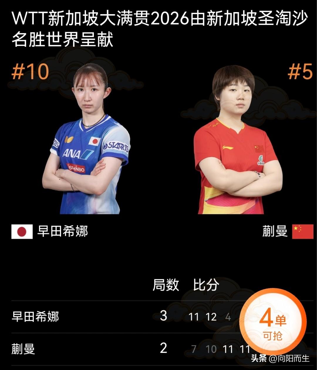 看到蒯曼低着头走下场那个样子, 心里真不是滋味! 和早田希娜打完,她跟教练就那么轻轻碰了下手,眼神直躲闪,连头都不敢抬。一个人缩在座位上闷头收拾包,那股子失落劲儿,隔着屏幕都能感觉到。 其实真没必要这么钻牛角尖。 真的太懂这种感觉了,拼到最后一分输球,换谁都会难受半天。明明自己已经拼尽全力,每一分都咬着牙在扛,可结果就是差那么一点点。[流泪] 不是打得不好,就是运气差了口气,这种无力感最磨人。球迷看着都心疼,更别说她自己了。 你说谁能一直赢下去?不就是输了一场球吗。 大家之所以替她紧绷着,估计也是因为对面站着的是早田希娜。毕竟翻翻以前的战绩,蒯曼赢她的次数可不少。去年年底还横扫过对方,今年一月份在多哈也是3比1拿下的。 这次新加坡大满贯,俩人又撞上了,球打得确实费劲。 在大比分0比2落后的死局下,蒯曼硬是咬牙连追两局。决胜局打到11比13,就差那么一口气,看得人心跳都快停了。 这种球输了确实窝火,但也说明实力就在那儿摆着呢,稍微差了点运气。 我觉得小姑娘还是背后的压力太大了,总想着不能输外战。其实偶尔栽个跟头真没什么,回来好好复盘,下次再把场子找回来就是了。 别在那儿自我怀疑了,赶紧把情绪调理好,后面还有比赛等着呢。蒯曼 孙颖莎蒯曼 蒯曼陈熠 林诗栋蒯曼 蒯曼女单冠军