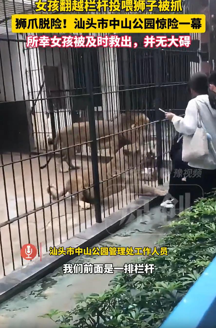 无知者无畏!广东汕头,一女孩去公园看狮子,觉得离得远没意思,竟然翻越栏杆去喂狮子,结果担心的事情发生了,一只狮子突然抓住她的裤脚不松手,还好女孩及时被救出,没有酿成悲剧。网友:事教人一次会 监控显示,当时那只母狮动作快得很,爪子从铁栏缝里伸出来,一把就勾住了姑娘的裤子,还使劲往里拽,嘴也没闲着,又撕又咬的 姑娘当场吓得哇哇大哭,旁边的人惊叫声四起。好在一个男的冲上去死死拽住她胳膊,跟狮子硬生生拉锯了半分多钟,还捡了根铁杆子戳狮子,最后总算把人拽回来了 有人可能会说,狮子关在笼子里,能有多大事?这种想法才是最要命的。狮子再怎么说也是猛兽,不是大猫。它们的本能、力量、反应速度,跟人完全不是一个量级的 隔着笼子看,那是观赏;把身体探进去,那就是把自己送进猎食区了。姑娘可能就想着喂一下,拍个照,发个朋友圈,但狮子眼里,伸进来的那就是猎物 这次能脱险,纯属运气好,旁边有人反应快。要是当时没人,或者那只狮子较上劲不撒手,后果谁都不敢想 网上有句话说得挺在理:事教人一次会。很多规矩看着多余,其实都是用教训换来的。公园设栏杆、挂警示牌,不是跟游客过不去,是真出过事。可偏偏有人不撞南墙不回头,非得亲身验证一下才信 希望这姑娘经过这一吓,以后能长点心。也希望看到这事儿的人能记住,有些边界,真不能越过去