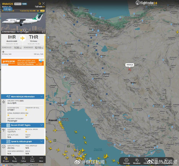极目新闻记者注意到,在航班查询网站flightradar24上,从伊朗沙赫尔飞往德黑兰的马汉航空IRM4526次航班位居搜索榜榜首,此次航班于北京时间14时05分起飞,计划于北京时间16时40分降落。但截至发稿时,IRM4526次航班已查询不到。