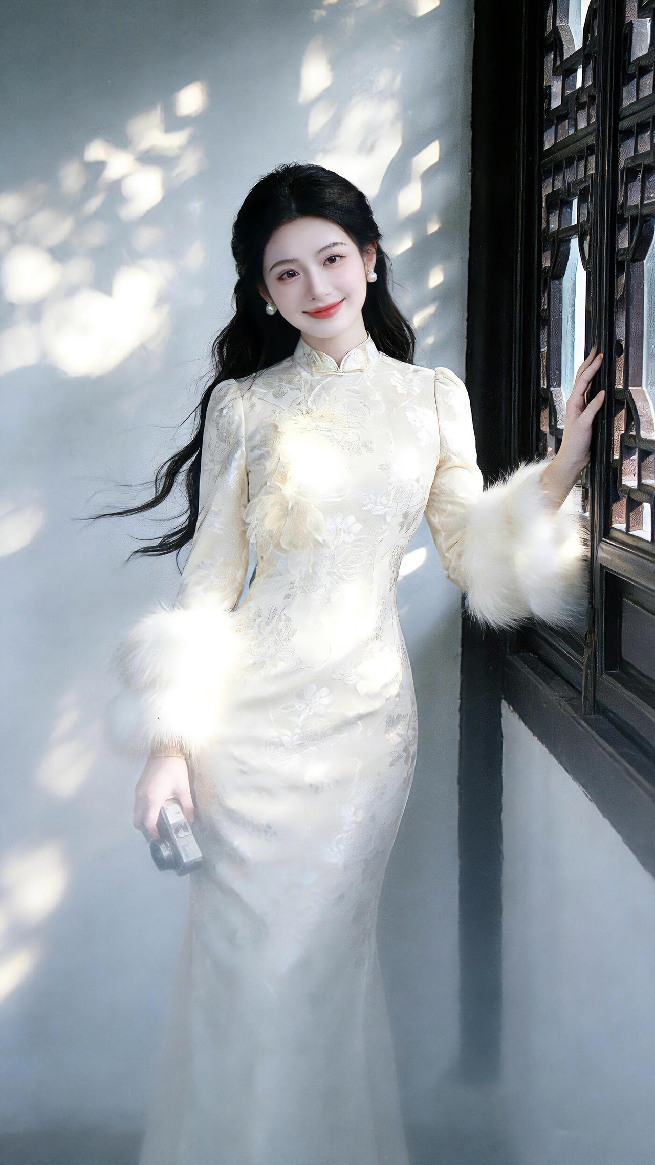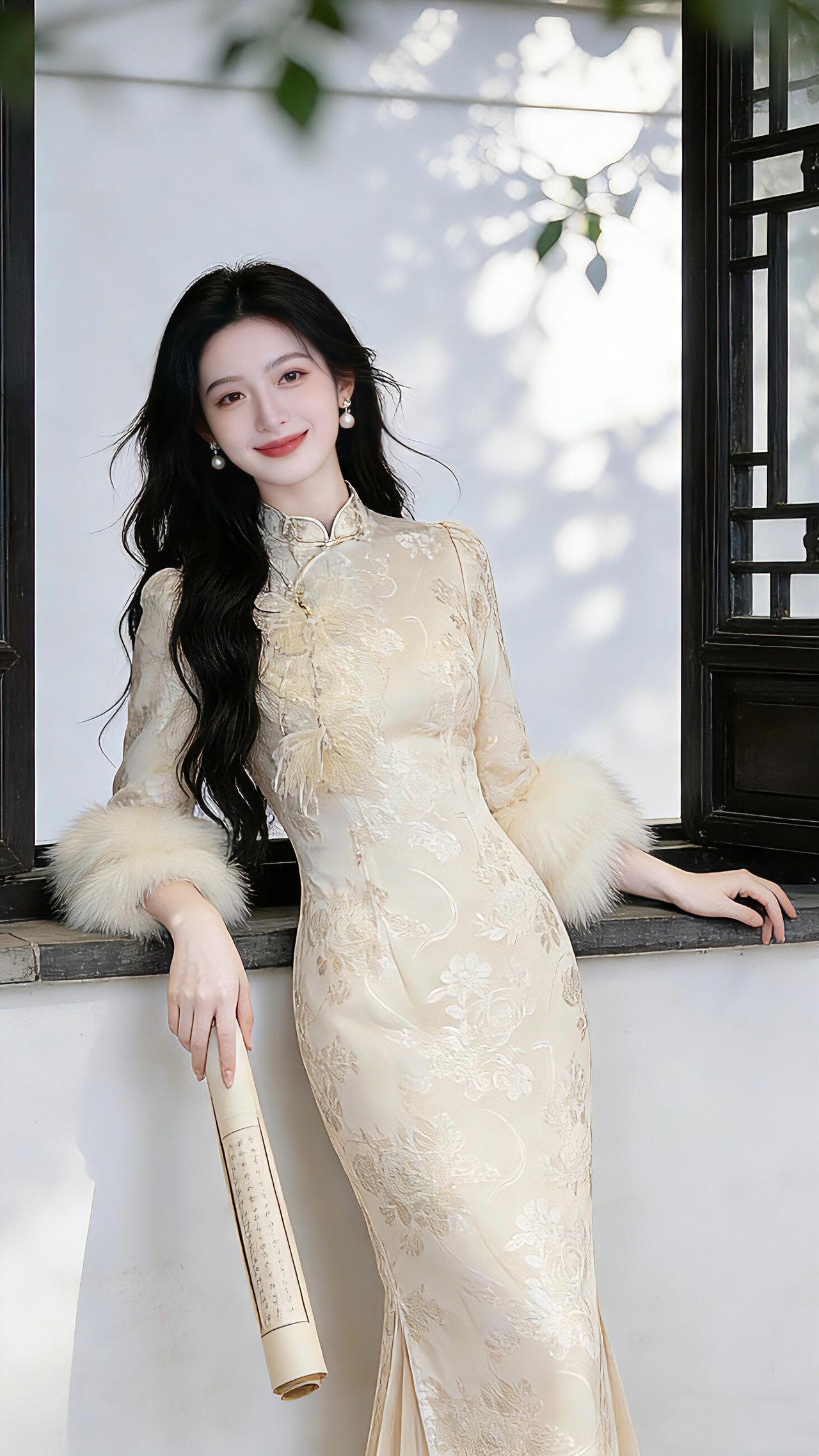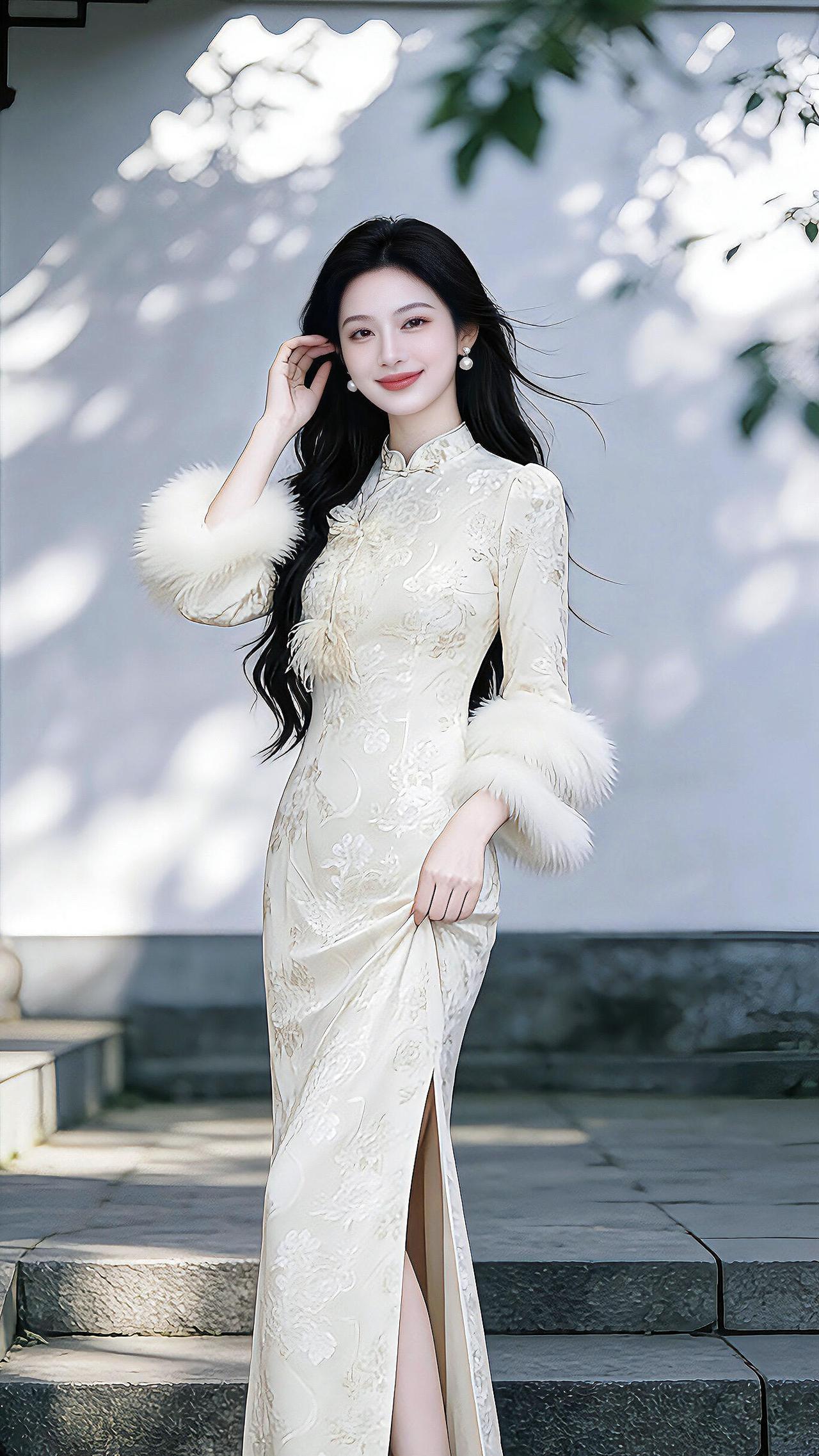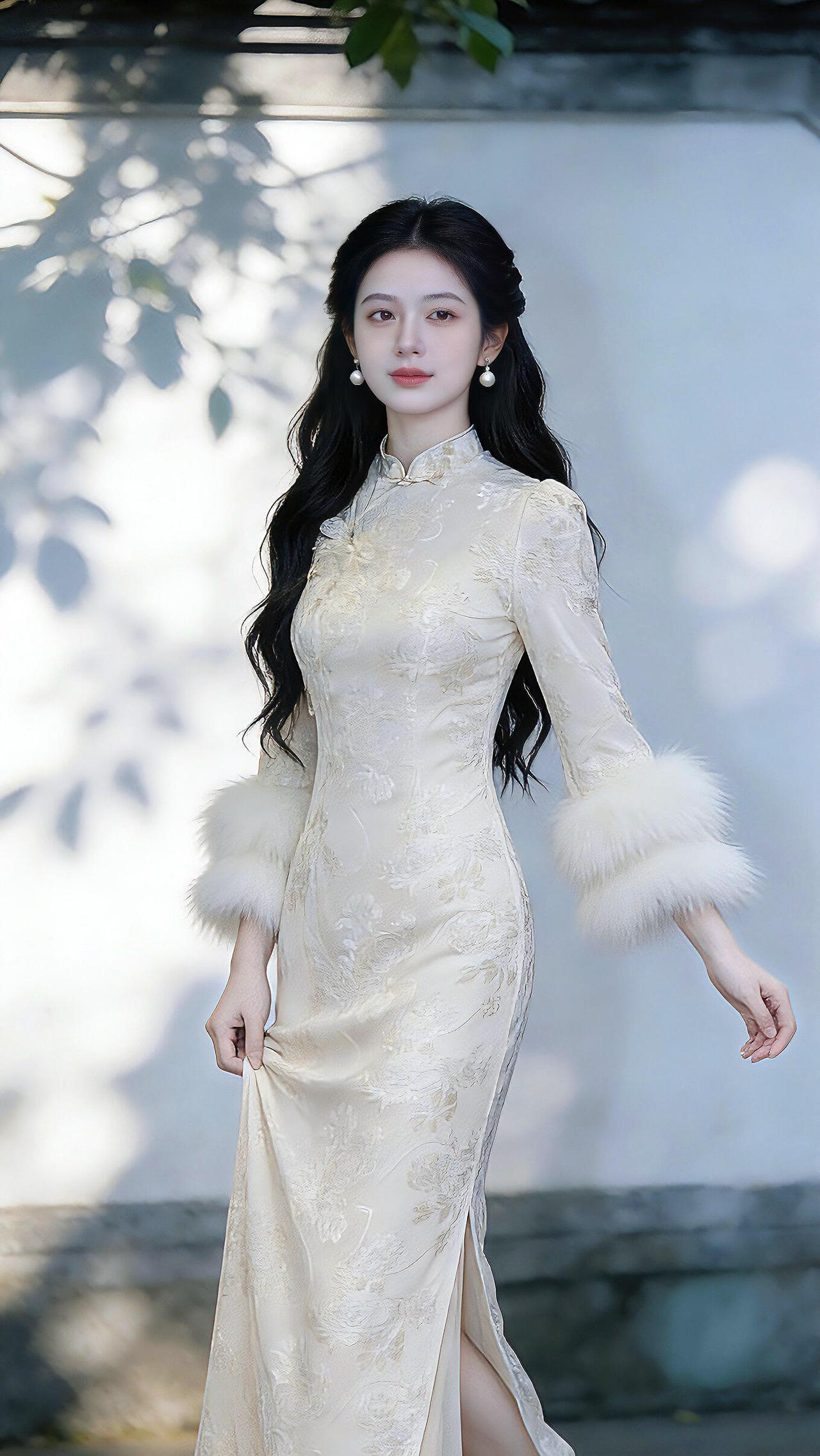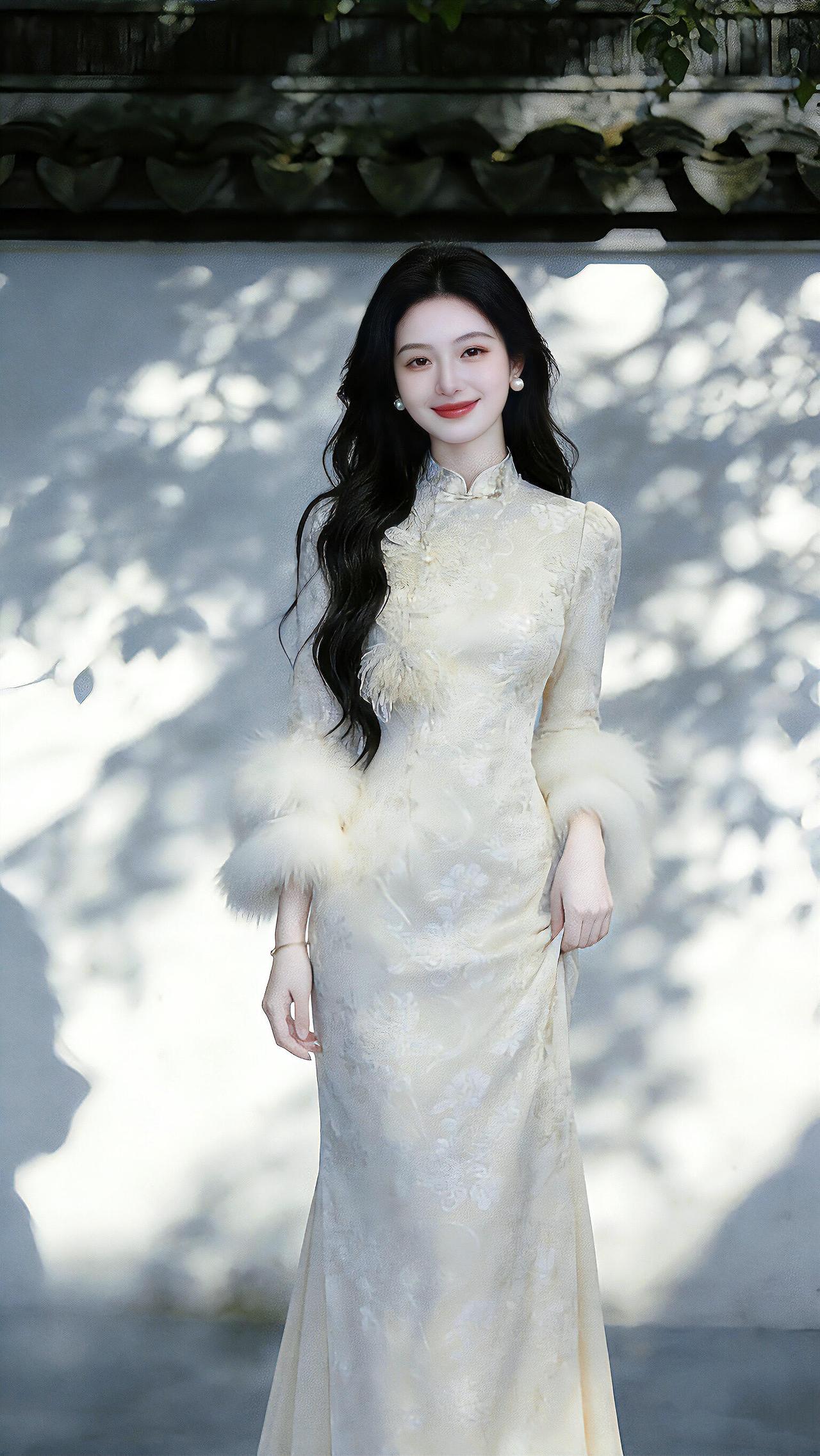 旗袍是最能勾勒东方女性韵味的服饰,穿搭讲究简约雅致、恰到好处。蛋青色这类清雅色系
