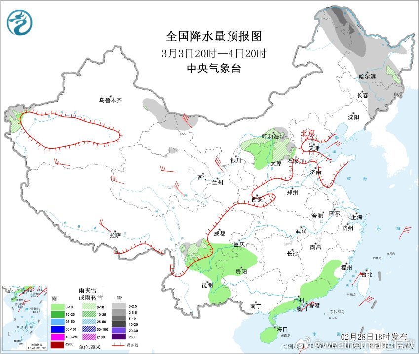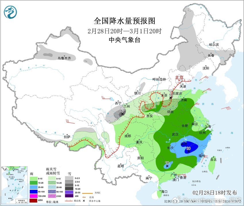 预计2月28日20时至3月1日20时,湖南南部、江西中南部、福建西北部、广西东北部、广东西北部等地的部分地区将有短时强降水天气,小时雨量20-40毫米,局地可达40毫米以上。此外在甘肃陕西山西河南河北部分地区有降雪或雨转雪,部分地区有大雪或暴雪(详见上一条微博分析)。