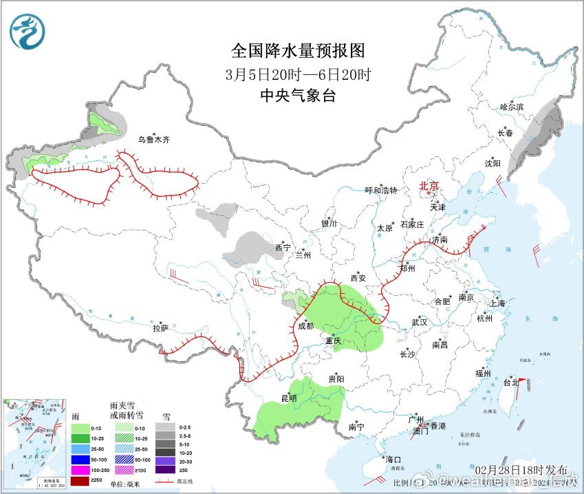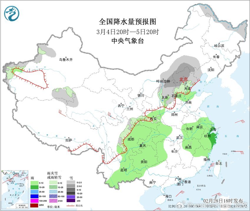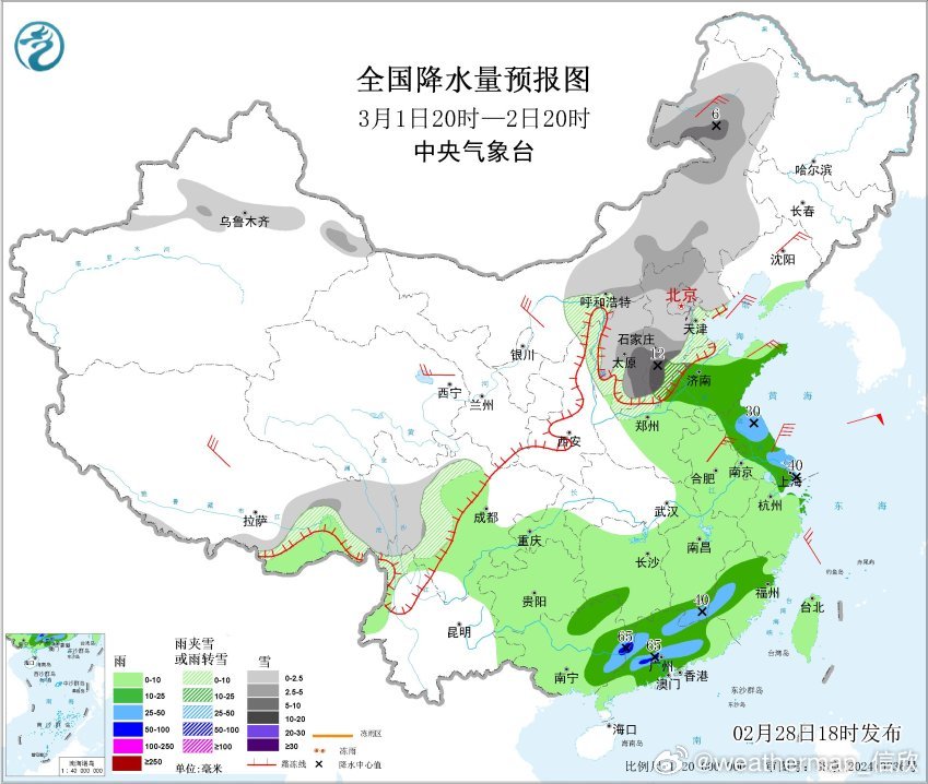 预计3月1日20时至2日20时,内蒙古东北部、山西东南部、河北南部等地部分地区有大到暴雪(10~12毫米)。山东大部、江苏大部、上海、福建中西部、广东大部、广西北部和东部等地部分地区有中到大雨,其中,广东中部和西部、广西东部等地部分地区有暴雨(50~65毫米)。北京在3月2日早晨-上午较大概率会下雪。