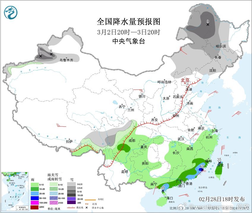 预计3月2日20时至3日20时,内蒙古东北部、黑龙江西北部、新疆伊犁河谷等地部分地区有大雪(5~9毫米)。四川盆地西南部、福建中南部、广东中南部、广西东南部、台湾岛中北部等地部分地区有中到大雨,其中,福建南部等地部分地区有暴雨(50~65毫米)。