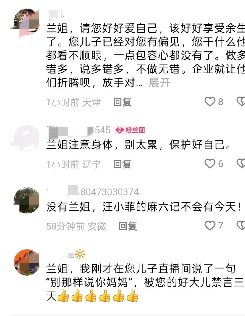 汪小菲又上来四六不分的劲了,他吐槽张兰没有边界感,不让发照片非发。兰姐粉丝说发就发了还能怎么着?他把人家移出直播间,还说:没怎么着,你不也看了也评论了吗,就是不想让你看,出去出去~ 讲真哦,这一出就有点敌我不分、横蛮不讲理了。 直播间很多粉丝看见他一直在那叨叨叨的说兰姐心里都不舒服了,而且他今天的直播,肯定会成为黑粉攻击兰姐的话题。所以很多人说“别说了、别说了”,还有人替兰姐解释,说她也是一番好意,想让大家看看你是一个非常合格的爸爸。 但是他越说越上劲,还把替兰姐说话的人移出了直播间。 这一下,兰姐粉丝很多当时就退出直播间,给她留言。都是让她学会好好爱自己,什么也不管,说人家汪大爷啥也不管反而成了好人…… 哎,大家都替兰姐委屈呢~