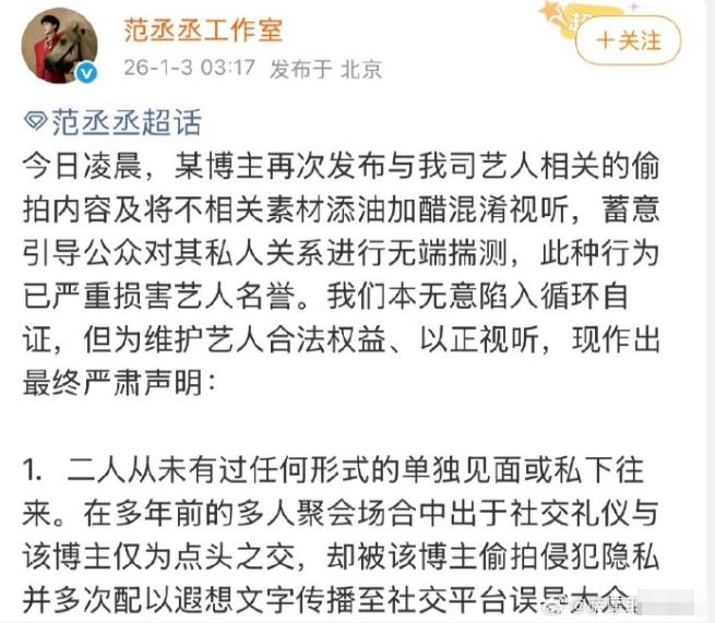 范丞丞工作室辟谣速度真快! 半夜两点多,工作室辟谣“不认识,没交集”,网友还没有吃到瓜,已经被他工作室火速辟谣了,上次司晓迪的爆料,他工作室凌晨三点多辟谣,26年两次辟谣都是大半夜,虽然网友调侃他工作室两班倒,看来不仅仅是调侃而已,大概率是团队真的有人专门负责半夜的舆论监测,虽然辟谣速度是真快,但是如果真没啥事,也没必要惊弓之鸟成这个样子。