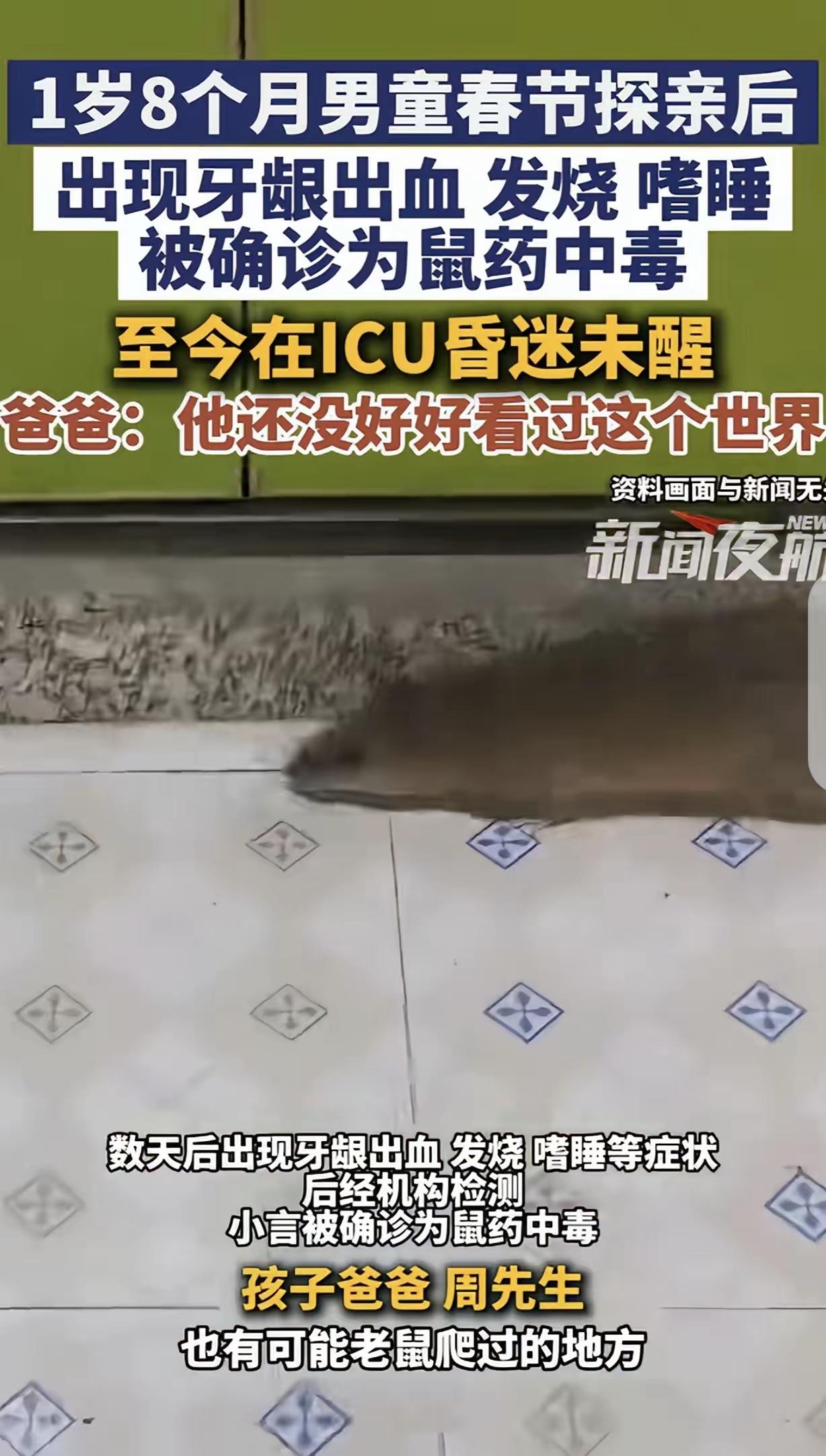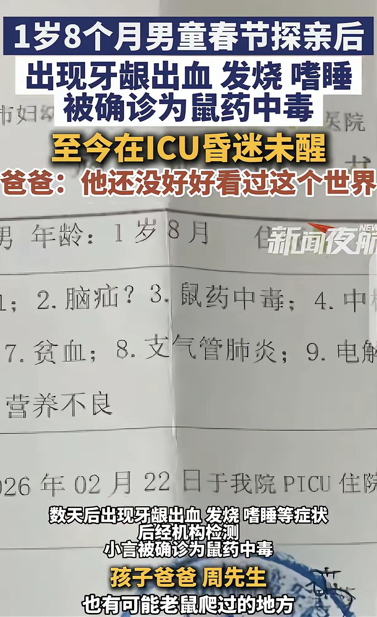 “细思极恐!”贵州毕节,一男子带着1岁8个月儿子去走亲戚,回来后没几天,儿子就牙龈出血,发烧嗜睡,男子赶紧带儿子去医院,儿子被确诊鼠药中毒,直接进了lCU,靠呼吸机续命。男子崩溃了:我儿子还没好好看过这个世界。网友:赶紧报警,人心难测,没那么简单,肯定被人算计了。 这件事最近在网上传开后,很多人看了都心里发紧,一个才一岁八个月的小宝宝,还没怎么认识这个世界,就因为一场走亲戚,遭遇了这样的飞来横祸,想想都让人揪心。 据了解,这个小男孩叫小言,跟着爸爸去贵州毕节的亲戚家串门,本来是件热闹又开心的事,没人能想到,这一去竟然埋下了致命的隐患。 从亲戚家回来没几天,小言就开始不对劲,先是牙龈莫名出血,接着又发起了高烧,还总是昏昏沉沉地嗜睡,精神状态特别差。 孩子的爸爸察觉到不对劲,赶紧带着他去医院检查,谁知道检查结果一出来,直接让一家人陷入了绝望,小言被确诊为鼠药中毒,情况十分危急,直接被送进了ICU,靠着呼吸机维持生命。 看着病床上浑身插满管子、毫无反抗之力的儿子,孩子爸爸彻底崩溃了,那句“我儿子还没好好看过这个世界”,说出了一个父亲最深的痛苦和无助。 这件事被发到网上后,很快引起了网友们的广泛关注,大家都特别心疼这个小宝宝。 很多网友第一时间想到的就是有人故意作祟,纷纷留言让家长赶紧报警,说人心难测,这么小的孩子,肯定是被人算计了,还有人猜测是不是亲戚家有人故意投毒。 一时间,网上全是各种猜测,大家都在谴责那个假想中的“投毒者”,觉得太残忍,连这么小的孩子都不放过。 但随着警方的深入调查,真相慢慢浮出水面,并不是大家猜测的那样有人故意投毒,而是一场让人惋惜的意外。 原来,小言去走亲戚的那户农家院子里,墙角的杂物堆处撒了鼠药,是用来灭老鼠的,没有任何警示标志。 一岁多的孩子正是好奇心最强的时候,对什么都想摸一摸、尝一尝,在大人们不注意的短短几分钟里,小言可能是摸到了地上的鼠药颗粒,又顺手放进嘴里吮吸,就这样意外接触到了毒物。 鼠药的毒性很强,有一定的潜伏期,所以回家后过了几天才出现症状,一开始家长还以为是普通流感,耽误了最佳的救治时间,等到牙龈出血、高烧不退时,已经来不及了。 现在小言还在ICU里抢救,靠着呼吸机续命,一家人承受着巨大的痛苦和压力。 网友们得知真相后,也从一开始的愤怒猜测,变成了惋惜和心疼,大家都感慨,有时候意外比恶意更让人无奈。 其实生活中,很多针对孩子的危险都藏在不经意间,尤其是对于还不懂事的小宝宝,家长一时的疏忽,就可能造成无法挽回的后果。 大家对此怎么看?欢迎评论区留下您的观点!