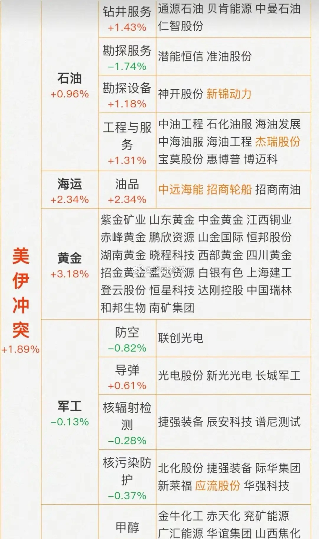 中东失控!美伊冲突升级,A股这五大板块下周能否掀涨停潮!?美伊冲突引爆避险狂潮,油气、黄金、军工、化工替代等主线值得关注。(1)油气板块中,中国海油依托成本优势尽享油价红利(2)黄金板块迎来避险资金涌入,紫金矿业、山东黄金等龙头价值凸显;(3)军工领域,中航沈飞、中无人机等企业承接中东军工需求,订单预期向好;(4)化工与战略小金属赛道,宝丰能源、红星发展等企业凭借产能优势,承接伊朗供给缺口带来的市场机遇。(5)中东冲突全面升级,霍尔木兹海峡随时可能被封锁,全球石油运输大动脉告急,中远海能、招商轮船值得关注……~风险提示:以上内容仅为信息整理,不构成任何投资建议,股市有风险,投资需谨慎。美伊开打油气概念股A股军工板块美伊核博弈伊朗摧毁美军雷达