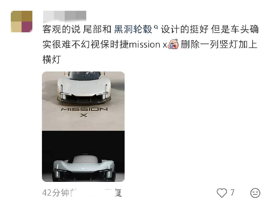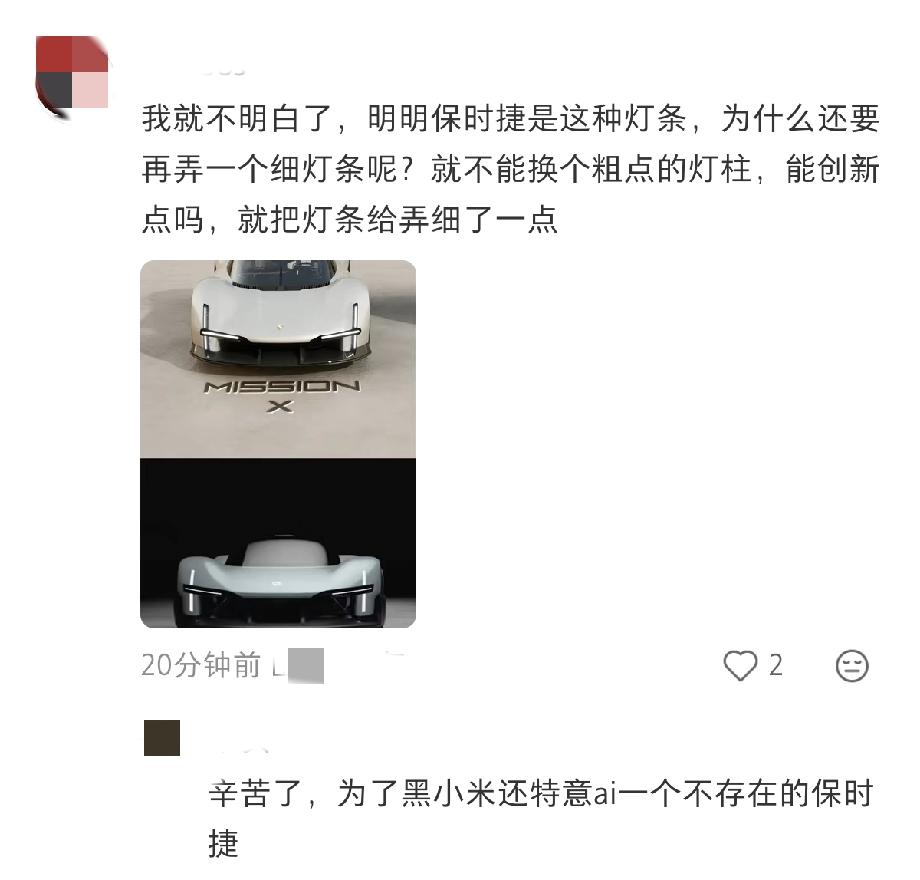 真的无语了! 小米一开发布会,黑子立马就上线了。超跑概念车刚刚公布 一堆水军就开始在评论区黑小米概念车抄袭保时捷概念车 还是熟悉的配方 发个对比图完全就是通过p图,强行让两个车看起来差不多 现实是两个车的大灯是完全不一样的 小米是两个交叉的细长条,保时捷是两条平行的细长条 这种通过p图的方法来黑,真的可恶,很多不明真相的人会去相信,以为真的抄袭 图1(黑子的对假比图) 图23(评论截图) 图4(保时捷概念车真正的样子) 小米进军豪华车 小米汽车