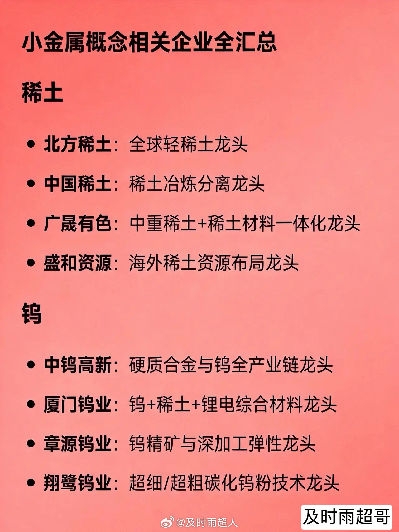 小金属概念相关龙头企业全汇总稀土北方稀土:全球轻稀土龙头中国稀土:稀土冶炼分离龙