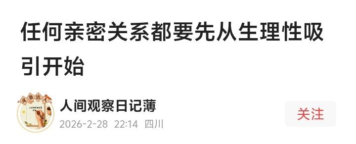 成都相亲角惊现“邋遢男”50次全败!心理学家揭秘:异性第一眼不看钱不看脸,靠的是这种“动物本能”! (来源: 人间观察日记薄) 朋友相亲五十次,次次无果。不是他条件差,而是他总穿着皱巴巴的衬衫,头发乱得像鸟窝。介绍人委婉提醒:“收拾一下,成功率翻倍。”他却不以为然:“真感情何必看外表?”结果呢?连开口展示内在的机会都没有。 这背后藏着一个残酷真相:人与人之间的吸引,始于最原始的生理本能。就像动物择偶先看羽毛光泽,人类也会通过视觉、嗅觉瞬间判断“是否想靠近”。一见钟情不是玄学,是大脑在0.1秒内被荷尔蒙击中的信号。 研究显示,初次见面时,对方身上的气味、仪态甚至袖口细节,都会触发潜意识的好感或排斥。那个著名的“T恤实验”中,女性仅凭气味就选出了最心动的男性。嗅觉记忆直通情感中枢,比千言万语更直接。 可多少人败给了“懒”?总以为灵魂至上,却忘了人先是视觉动物。你穿着得体,不是讨好别人,而是释放“我尊重这场相遇”的信号。就像雄鸟求偶前梳理羽毛,是本能,也是诚意。 更扎心的是,这种吸引一旦缺失,后续再多努力也难弥补。相亲场如战场,第一眼没火花,谁还愿探你灵魂多有趣?朋友后来听劝,简单修眉换衣,第三次约会就遇上了聊到深夜的人。 但生理吸引只是敲门砖。真正的关系还需“细节升温”。过马路时自然护住对方肩膀,吃饭时递一张湿巾……这些微小动作,比玫瑰钻戒更能触动心弦。爱不是宏大的宣言,是本能驱使下的温柔本能。 如今很多人把“躺平”挂嘴边,说缘分天注定。可若连门都不愿开,风怎么吹进来?主动收拾自己、释放善意,不是功利,而是告诉世界:我准备好了,请让我走进你的生命。 从古至今,爱的本质从未变过——它是心跳加速的冲动,也是烟火日常的守护。就像《白蛇传》里千年修得的相遇,若没有那一眼惊鸿,何来后续的生死相依? 两性关系 相亲真相