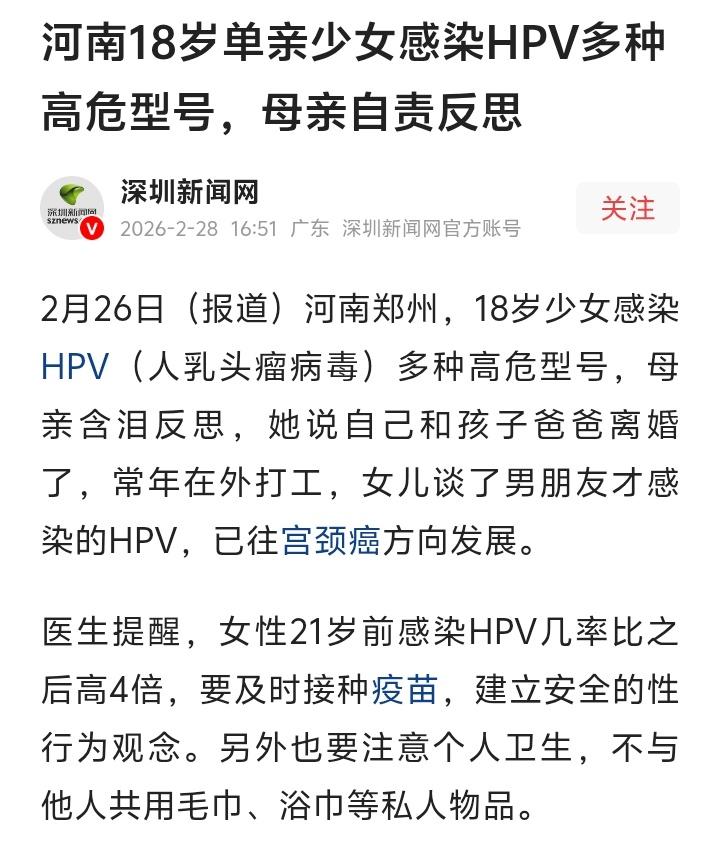 河南郑州18岁单亲少女感染高危HPV,母亲含泪自责:离婚后我忙着打工,却忘了教女儿如何保护自己 当医生说出“已往宫颈癌方向发展”时,诊室里的空气仿佛凝固了。一位母亲紧紧攥着女儿的手,指甲几乎嵌进掌心,眼泪无声地滑落。她反复喃喃:“都怪我,是我没教好你……”这个本该在校园里绽放青春的18岁女孩,此刻却因感染多种高危HPV病毒,站在了命运的十字路口。 母亲说,她和孩子爸爸离婚后,独自扛起了生活的重担。常年在外打工,她把挣来的每一分钱都寄回家,以为让女儿吃饱穿暖就是最好的爱。直到女儿交了男朋友,直到那张冰冷的检查报告摆在眼前,她才猛然惊醒——有些话不说,有些事不教,代价竟如此沉重。 这不仅仅是一个家庭的悲剧,更是千万留守青少年健康隐患的缩影。数据显示,21岁前女性感染HPV的几率比之后高出整整4倍。青春期的身体尚未成熟,免疫力相对脆弱,一旦缺乏正确的防护知识和及时的疫苗保护,就像在雷区中赤脚行走。 然而,比病毒更可怕的,是社会的偏见与沉默。每当类似新闻出现,总有人第一时间指责女孩“不自爱”“行为不检”,却鲜少有人追问:我们是否给过她们足够的教育和关怀?当父母为了生计奔波,学校对性教育欲言又止,孩子们该从哪里学会保护自己? 医生的提醒像一记警钟:HPV疫苗是重要的防护盾,但比疫苗更早该接种的,是正确健康的性观念。这不仅是女孩的必修课,也是男孩需要明白的责任。真正的保护,从来不是等到出事后的悔恨,而是提前筑起认知的围墙。 母亲擦干眼泪,开始陪着女儿积极治疗。她说,现在每天都会和女儿通话,不再只问“钱够不够”,而是学着聊聊身体、谈谈边界。这场病痛成了母女俩最痛的一课,却也撕开了那层讳莫如深的纱。或许,无数家庭都该从中看见自己的影子。 当我们讨论HPV时,我们在讨论什么?是医疗科普的缺失,是家庭沟通的断层,更是整个社会对青少年成长需求的集体反思。健康从来不是运气,而是教育的果实。别让沉默,成为下一代健康的头号杀手。 (来源:本文综合自大象新闻、都市报道、深圳新闻网等媒体报道) 健康警示 家庭教育