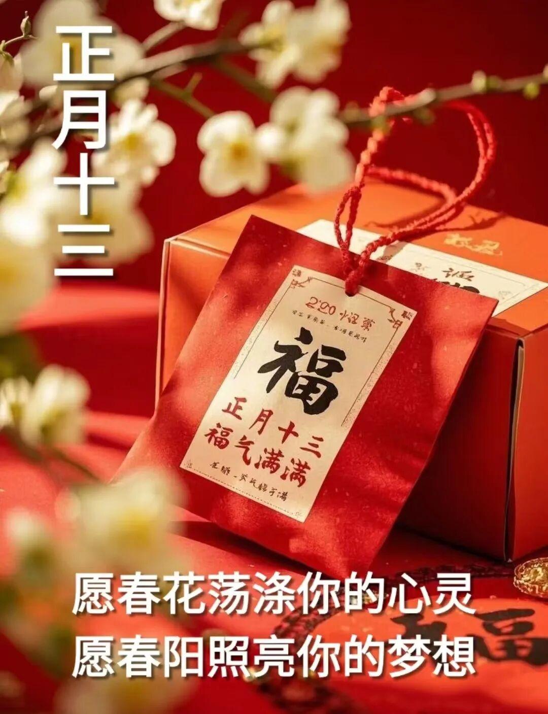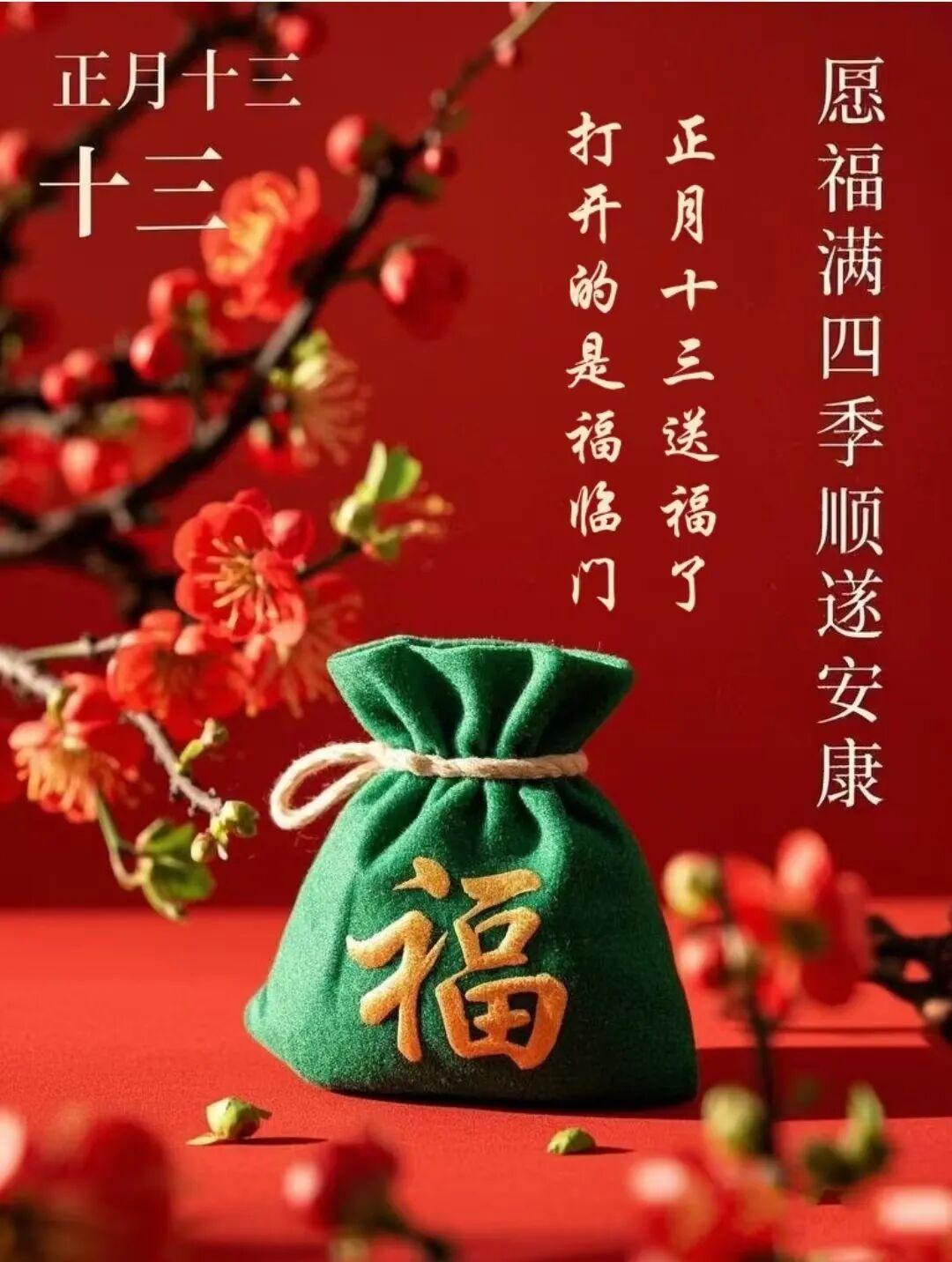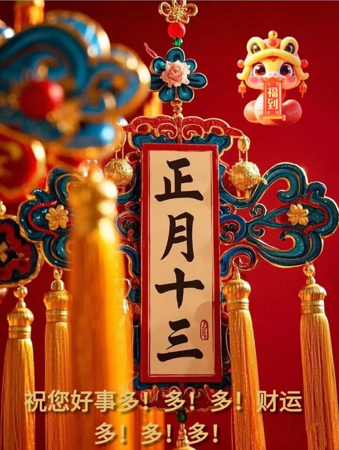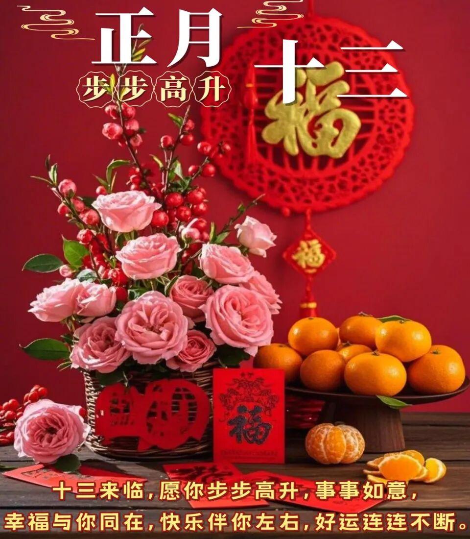 今天是大年十三 风柔雨润好月圆 幸福生活天天亨 良辰美景年年盼 冬去春来似云烟 流年逝水不复返 人生苦短几十年 不负韶华须尽欢 正月十三福先到 财源滚滚吉祥照 健康长寿一生安 鸿运当头幸福绕 正月十三祝福您 工作顺心宏图大展 朋友顺眼义薄云天 爱人顺义恩重如山 生活顺风好运连连