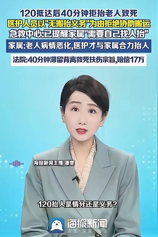 “必须严惩!”山西一85岁老人深夜发病,可万万没想到,急救人员到场后,竟因住在5楼没电梯,拒绝帮忙抬人,一众人硬生生僵持40分钟,直到老人病情恶化,最后抢救无效离世。事后家属愤怒起诉,却反遭医院上诉,最终判决结果出乎所有人意料! “我们没义务抬,帮你是情分,不帮是本分。” 家属当场就炸了锅,深夜里哪找得到人帮忙抬担架。50多岁的保姆和女婿急得直跺脚,一遍遍恳求医护人员搭把手。 医护人员却态度坚决,说救护车没配专职担架员,搬抬不是法定职责,万一出了意外担不起责任。 老人躺在病床上脸色越来越差,呼吸也越来越微弱。家属一边哭着打110求助,一边继续和急救人员理论,时间一分一秒在僵持中流逝。 等警方赶到合力把老人抬下楼,救护车开到医院仅用了4分钟,可老人已经没了自主呼吸,抢救了半天还是没能救回来。 家属咽不下这口气,把急救中心告上法庭,要求赔偿并道歉。没想到医院反过来上诉,坚称自己没有过错。 司法鉴定给出了明确结论,说急救人员处置不当、延误转运,和老人死亡有直接关系。法院最终判急救中心承担一半责任,赔偿17万余元。 这个结果让网友吵翻了天。有人说生命至上,急救不能只讲规定不讲人情;也有人替医护委屈,没专职担架员确实难办。 可不管怎么说,一条生命因为40分钟的僵持没了。大家更关心的是,以后再遇到类似情况,还会不会有人被“义务”两个字困住。