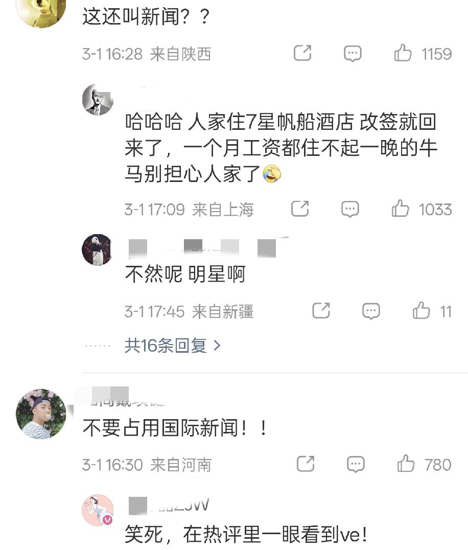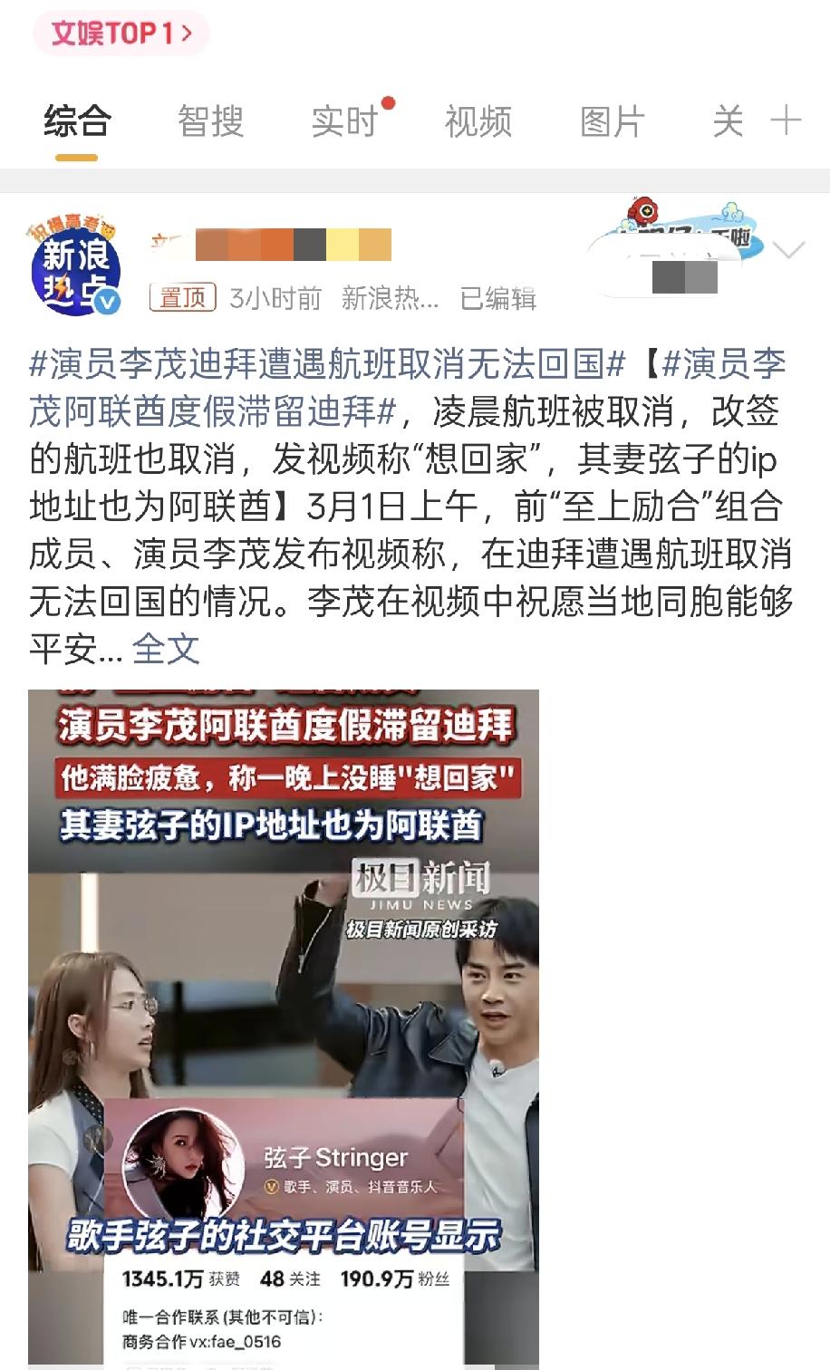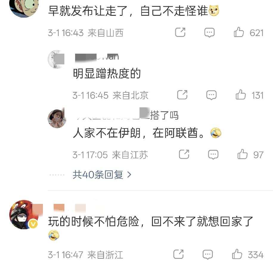 18线小演员李茂突然冲上了娱乐热搜榜1️⃣ 原因是过年期间,他带着全家去中东旅游,原定的航班因为那啥,取消了。 他发视频说,“想回家” 然而网友对此好像没有同情,更多是冷嘲热讽。 「早就发布让走了,自己不走怪谁?」 「玩的时候挺嗨的,回不来了想家了!」 「人家住的七星⛵酒店,改签就回来了,轮不到我等牛马担心」 看他的IP和背后环境,现在应该是在阿联酋,住的酒店也挺高级,安全系数应该挺高的。 而且他们是明星,机票再贵也是负担得起的。也难怪网友们难以共情。