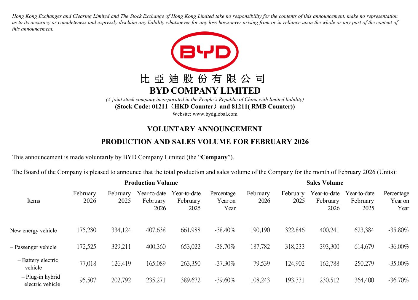 【比亚迪2026年2月销量及电池装机量公布】2026年2月,比亚迪新能源乘用车销量达18.77万辆,其中纯电动车(BEV)7.95万辆,插电混动车(PHEV)10.82万辆, 今年前两月累计销量为39.33万辆,同比下降。