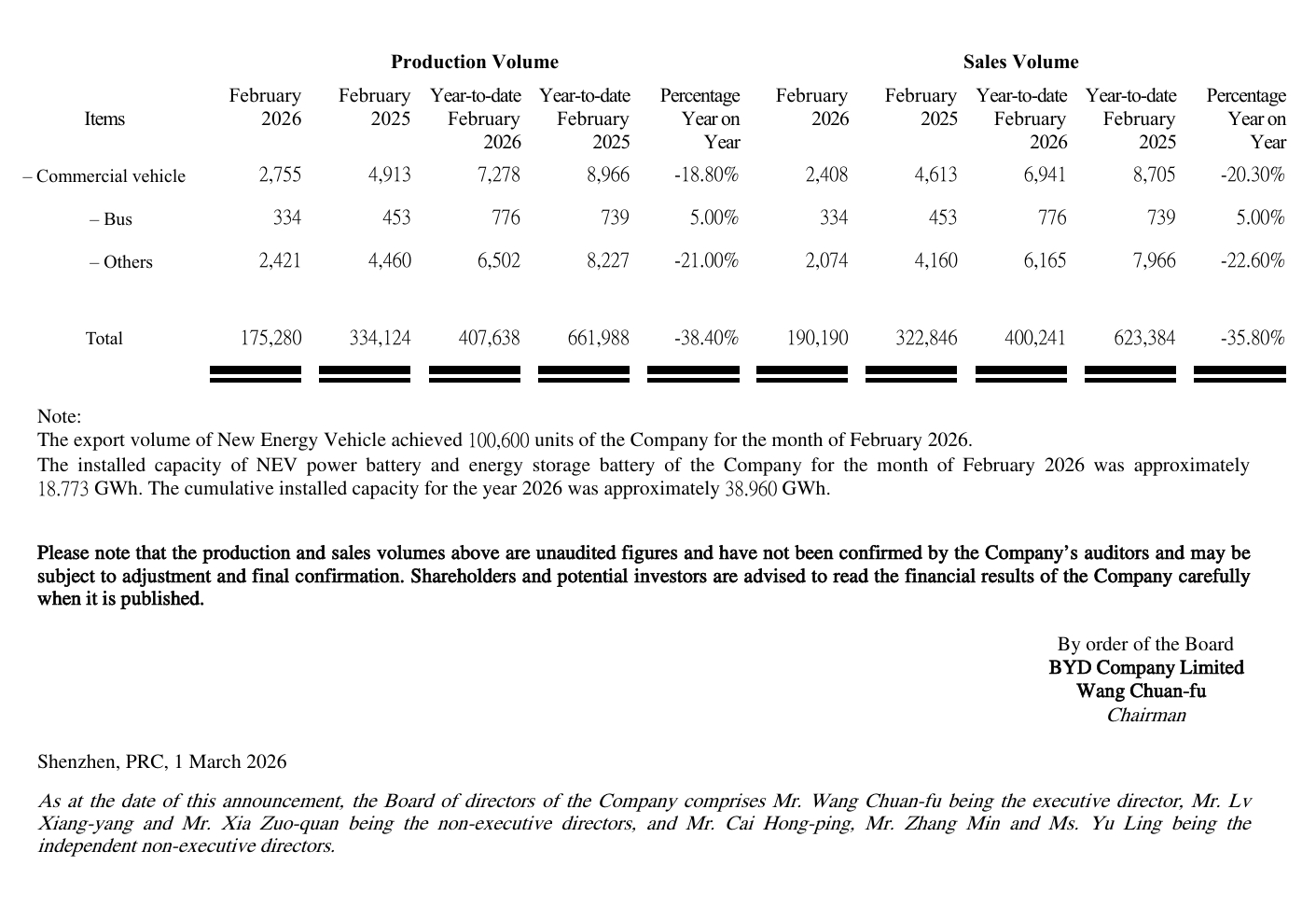同期,比亚迪新能源汽车动力电池装机量达18.773 GWh,1–2月累计装机量约38.96 GWh。
