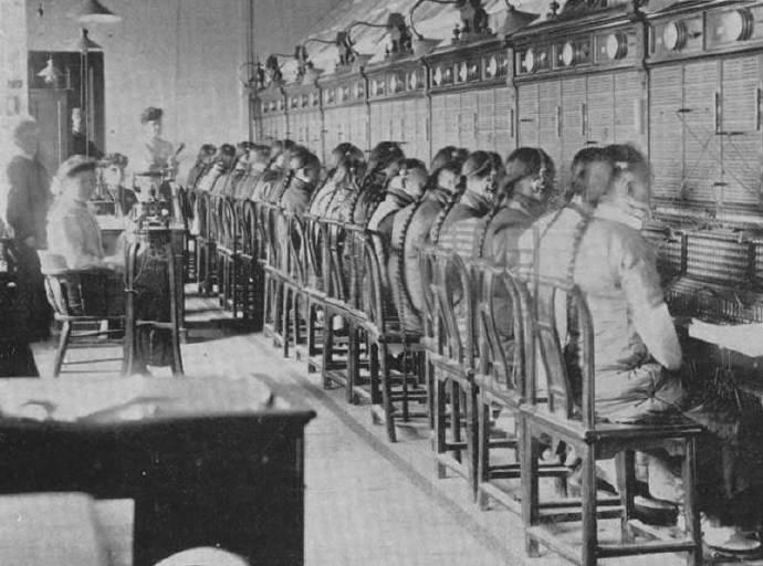 这张老照片是晚清上海电话公司的工作场景,一排留着长辫的中国男性接线员,身着中式短