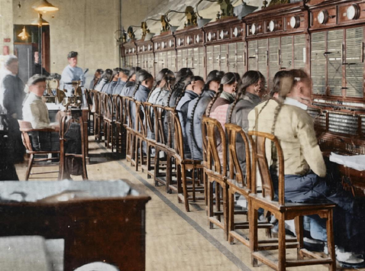 这张老照片是晚清上海电话公司的工作场景,一排留着长辫的中国男性接线员,身着中式短打,正专注地操作着西式电话交换台。他们是中国最早的一批电信从业者,负责人工转接电话线路。 长排的电话交换台是当时最先进的电信设备,每一台都对应着一条用户线路,接线员需要通过插线、拔线来完成通话转接。 1881年,丹麦大北电报公司率先在上海建立电话交换所,开启了中国商用电话的历史。这比电话发明(1876年)仅晚了5年,上海作为通商口岸,成为中国接触西方新技术的前沿。 时一部电话的年租机费高达150元大洋,再加上安装和设备费用,远超普通百姓的承受能力。因此,电话最初只是“沪上巨贾”的专属,是财富和身份的象征。