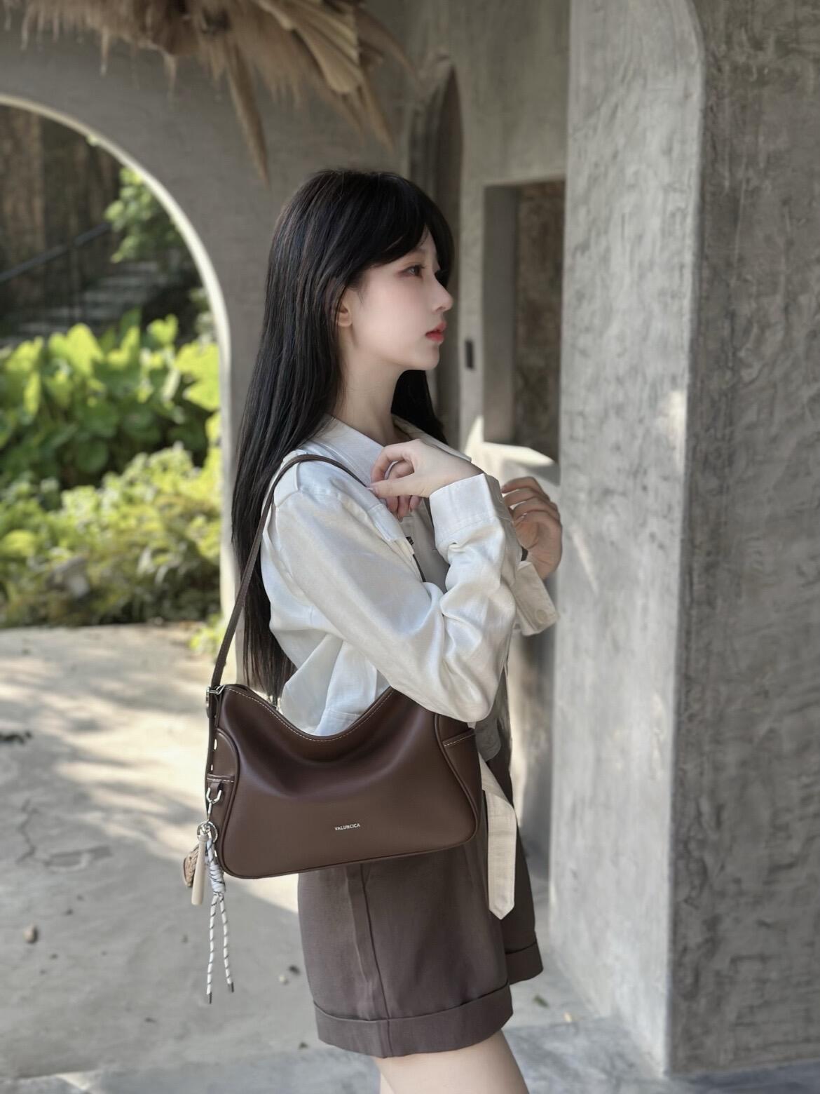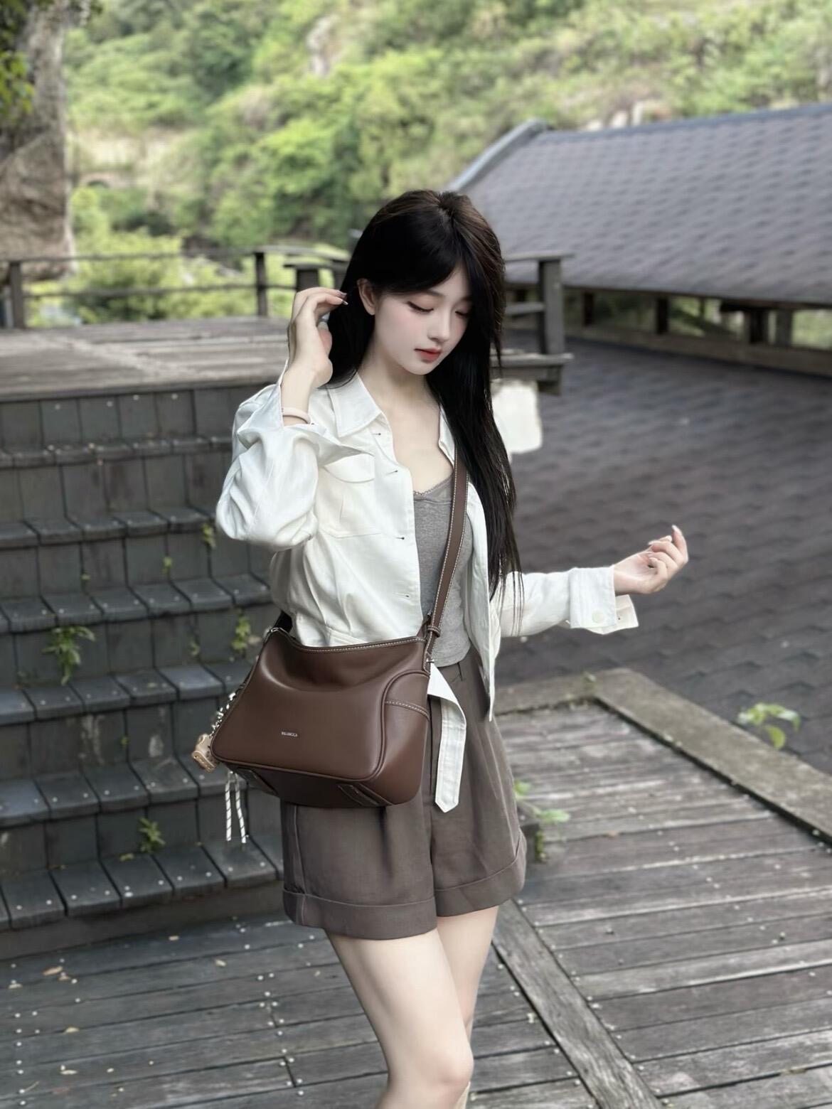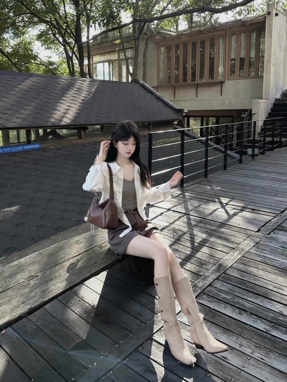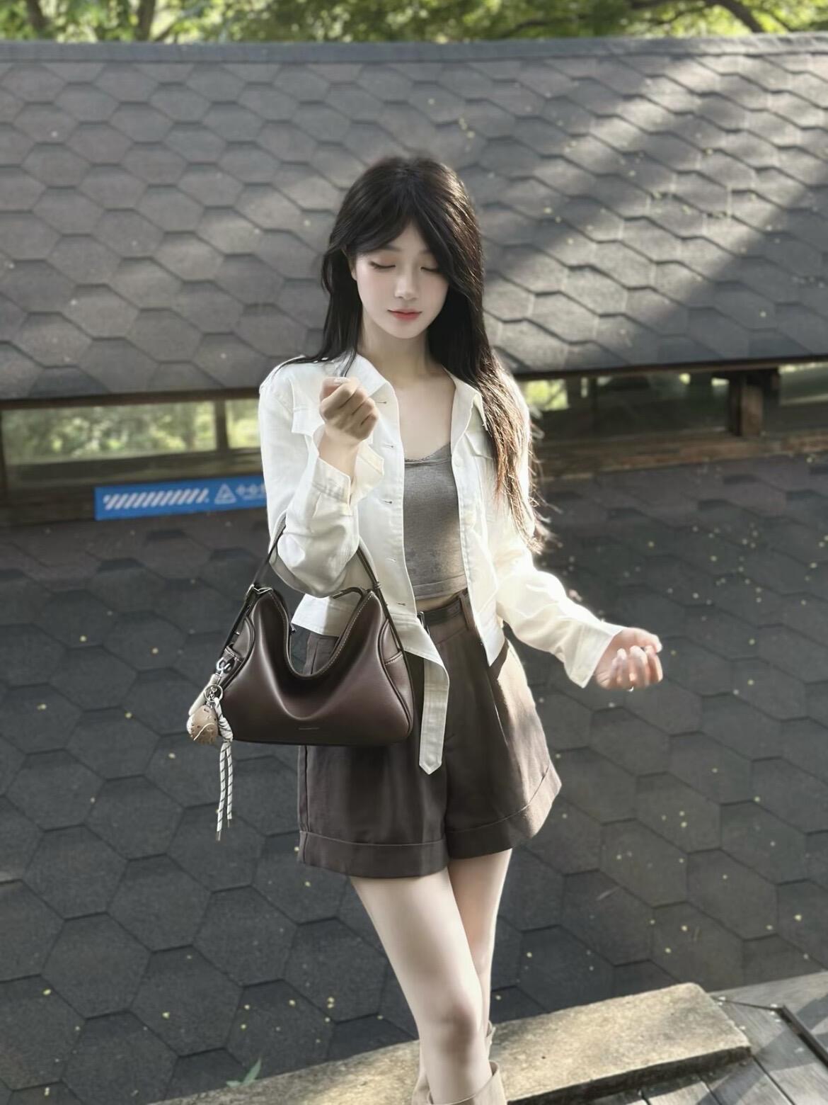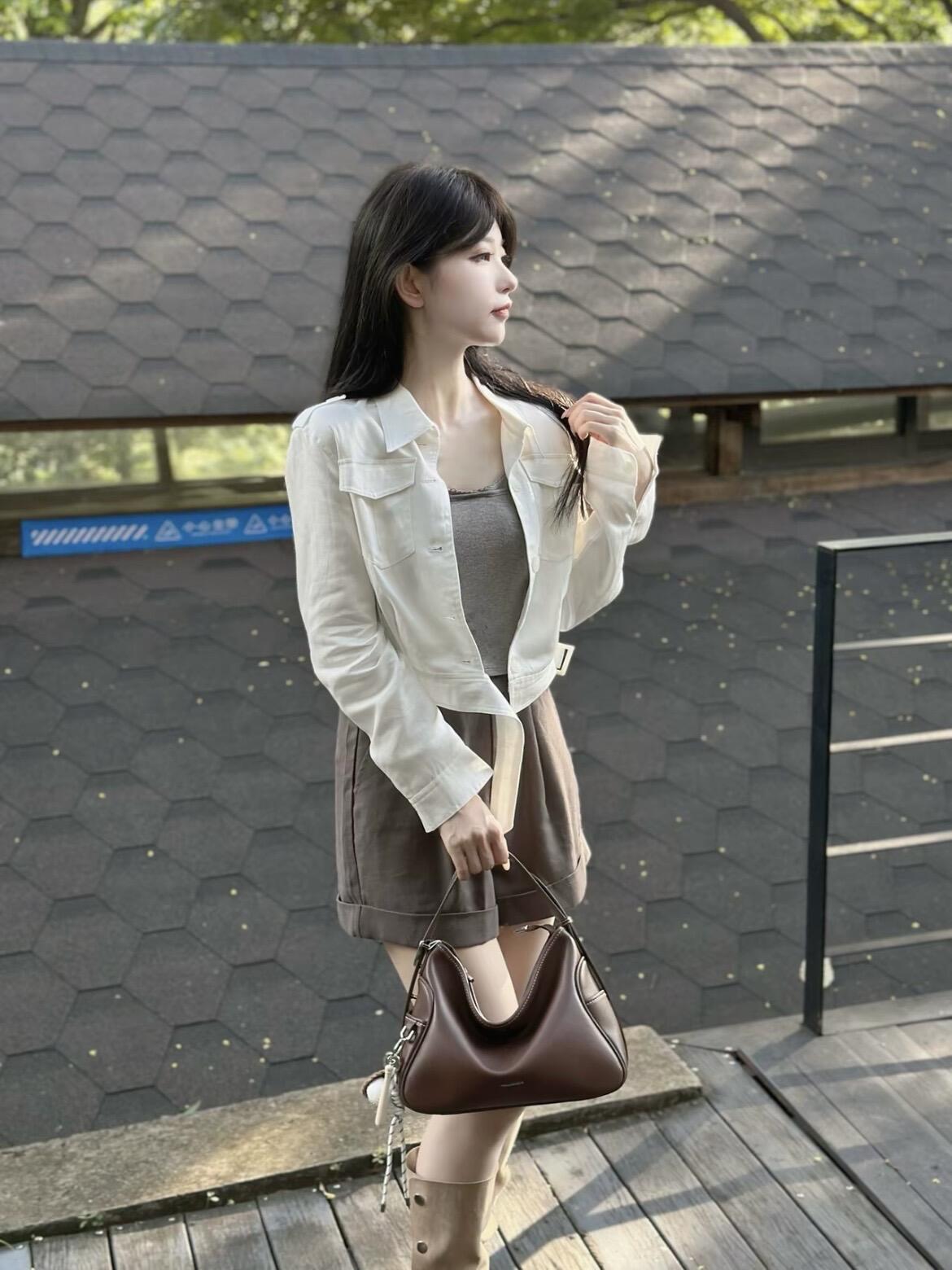 🧋🍃 .•早春韩系穿搭灵感分享ᵕ̈~ 最近这套穿得频率超高,舒服又上镜,思路超简单: 就是用低饱和的白、灰、棕做同色系搭配,不会出错还显高级。 短款白外套刚好卡在腰上,把腿显得巨长,里面搭个灰色小吊带,清爽又有层次。 深棕短裤和包包、靴子颜色呼应,不会乱,再配一双浅卡其长靴,露出一点腿,既有细节又不冷。