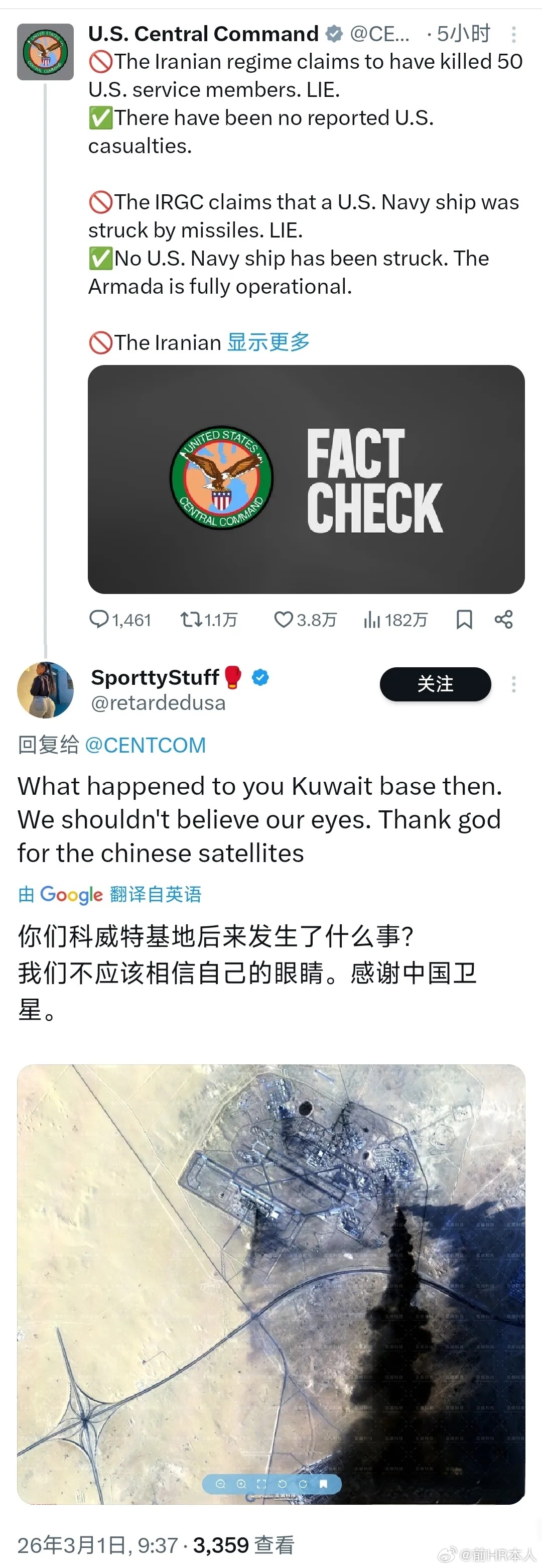 美军中央司令部撒谎说伊朗反击美国基地损失极小,不影响作战,结果被中国卫星图打脸了。