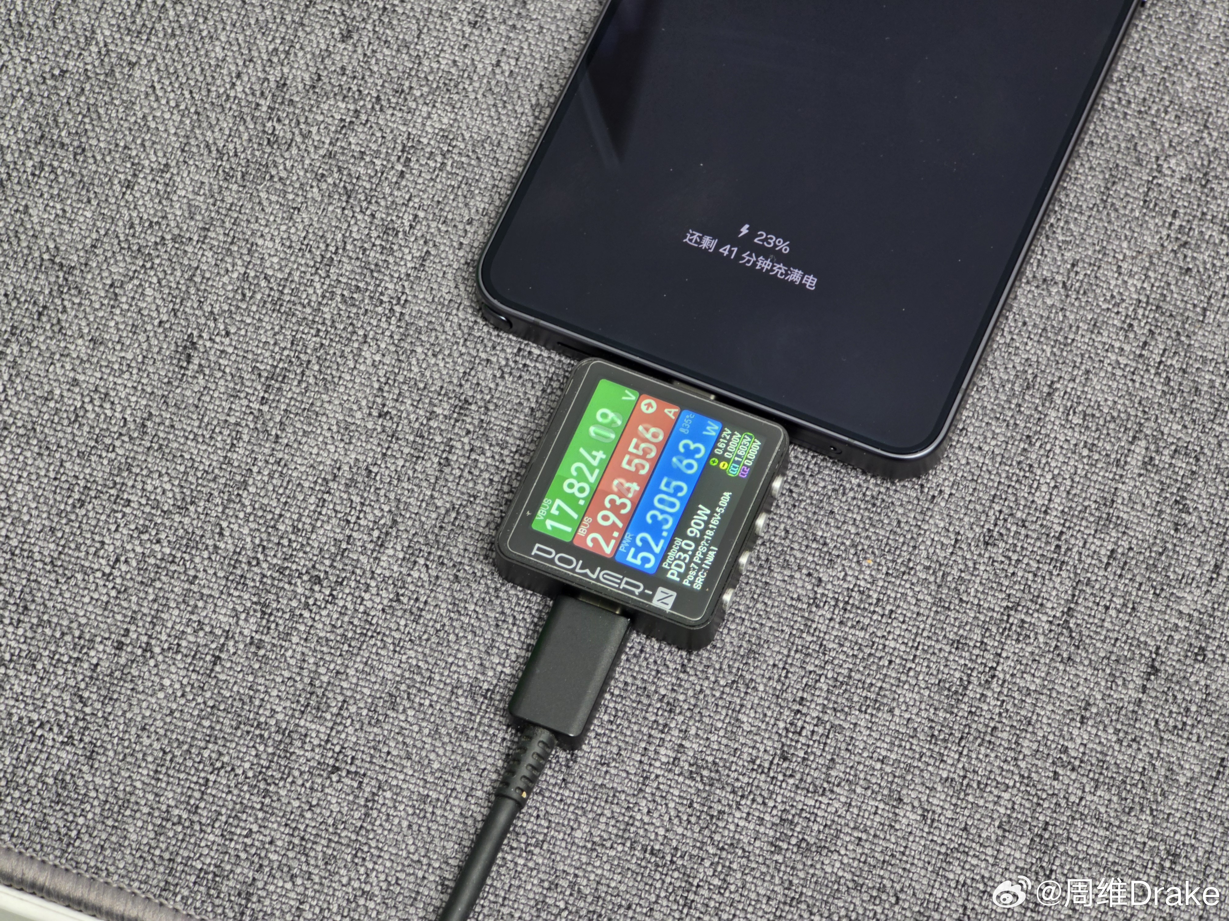 三星S26 Ultra 60W快充实测,超速了(三方头粗测,不很准)峰值功率52W维持约3min,转44W维持2min,之后一路34-36W维持约22min,74%之后触发主动降功率至20W以下,前台100%用时49.5min注:官方2C1A的65W头EP-T6530仅能触发45W档位(快充2.0),需购买官方60W头或支持对应PPS的三方头(20V/3A)