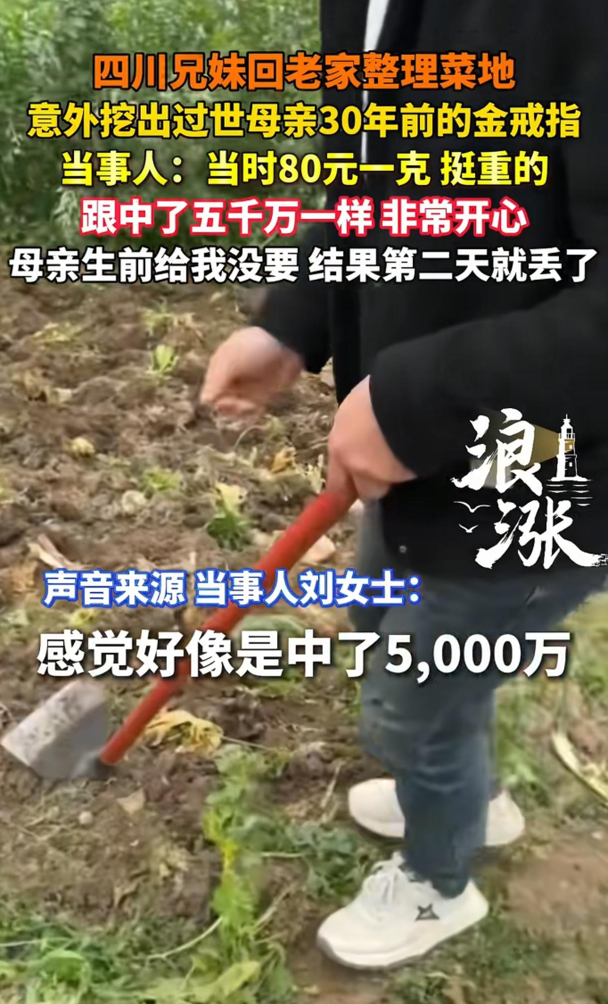 “破防了!”兄妹几人回老家过年,见屋后菜地荒废,就一起动手整理,谁知一锄头下去竟挖出亡母的金戒指,兄妹几人又惊又喜,比中了5000万还高兴。因为母亲临终时,一直念叨着这枚戒指,现在东西失而复得,终于可以告慰母亲在天之灵了。 (来源:浪涨新闻) 2月23日,正初初七,四川内江资中县,一户刘姓兄妹几人回老家过年。母亲已经去世一年了,但兄妹四人还是会回家团聚。 这天,兄妹几人见屋后母亲生前打理的菜园荒废已久,长满了杂草,就一起动手翻土、除草,打算重新种上菜。 翻地时,妹夫一锄头下去,土里突然出现一个沾着泥土的金色圆环,捡起来一看,惊讶不已:“挖到金戒指了!” 妹妹一把拿过来仔细端详,见戒指上刻着一个标准的“福”字,当即认出是母亲生前所戴、后来弄丢的那枚戒指,瞬间泪目,然后激动大喊:“老娘的戒指找到了!” 其余几人以为夫妻二人是开玩笑的,待围过来确认后,全都又惊又喜。 原来这枚戒指对兄妹几人意义非凡,它是30多年前兄妹几人凑钱为母亲定制的,上面还刻着“福”字,当时每克才80元,不仅分量厚重,更体现了子女们对母亲的爱。 然而,母亲一生节俭,平时并不舍得戴它,常常戴着假戒指出门,只在逢年过节、一家人团聚时才戴一戴。 两年前,母亲病重,自知时日无多,想将这枚戒指传给女儿,但女儿心疼母亲婉拒了,让母亲继续戴着。 谁知第二天戒指就丢失了。 全家人翻遍了房间、院落等都没有找到,为此母亲难过又自责,在临终时还一直念叨着这枚弄丢的戒指。 这事成了临终老人与子女们的一大遗憾。 没想到两年之后,女儿的丈夫竟在屋后菜地里挖出了它,让这枚埋了两年多之久的金戒指终于重见天日。 子女们推测,估计母亲当时身体虚弱,在打扫卫生时不小心将戒指扫进了垃圾里,再和粪土一起倒进了菜地。 如今,亡母的戒指沉甸甸的在手,母亲临终时念叨的东西终于失而复得了,兄妹几人几度哽咽落泪。 因为一看到戒指,就想到去世的母亲。 在家中的全家福照片前,兄妹几人哽咽着将这个好消息告诉给了母亲,以告慰母亲的在天之灵。 妹妹说:“这比中5000万还开心!” 之后兄妹之人共同决定,将这枚戒指永久珍藏,作为对母亲最珍贵的念想,代代传下去。 其实这枚戒指对兄妹几人而言早已不是金钱价值了,而是母亲一生节俭、牵挂子女的见证,也是对母亲永久的思念。 这件事太令人破防了,这不是普通的失物找回,而是跨越生死的亲情信物,填补了母亲的遗憾、子女的愧疚。 这枚戒指价值已远超实物价值,因为它是母亲的念想、子女的寄托、家族的记忆,更是家风的无声传承。