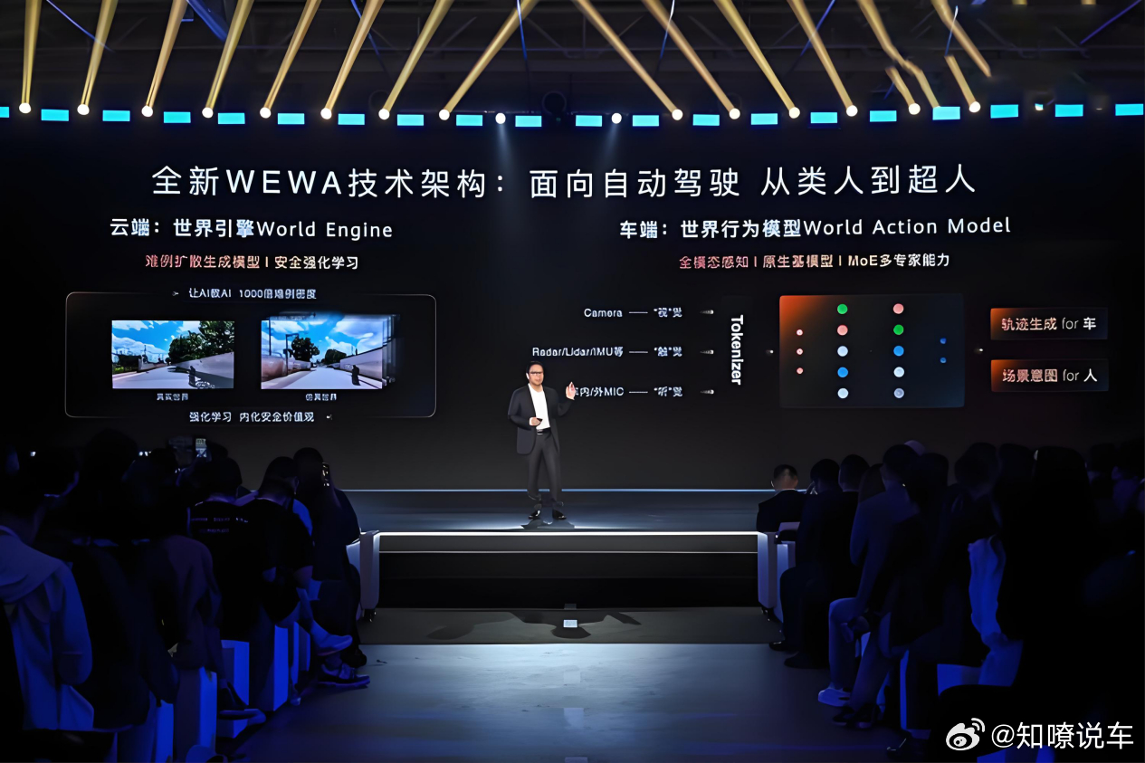 支撑这次跳代升级的是一套叫WEWA的架构,云端世界引擎负责生成极端场景——鬼探头、施工路段改道、暴雨视线受阻,这些真实路测里很难高概率撞上的突发状况,在云端可以做到千万级模拟训练,难例密度达到真实路测的1000倍。车端行为模型再把这些模拟经验融合到多传感器数据里,做出低时延的决策。