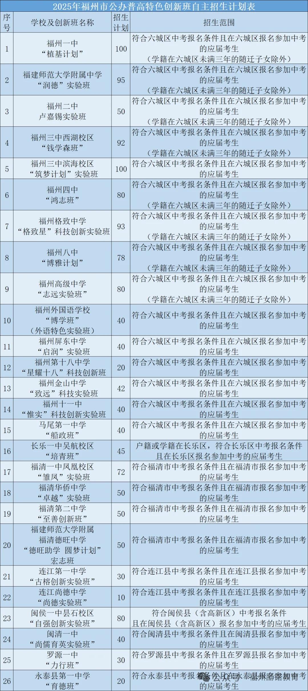 关注2026年福州市公办普高自主招生即将开始!初三毕业生注意了!根据近几年福州教育局普高自主招生逐年增加的政策,今年的自主招生名额只会比2025年多,2025年福州市共有26所公办普高学校进行自主招生。对比前一年,新增马尾一中、屏东中学、福州十八中、金山中学。市区16所普高共计招生1035人,同比前一年度扩招210人,扩招对大家来说机会也增加了。(详细表格见附图)报名形式分为:校长实名推荐、学校推荐、个人自荐三种形式。部分学校只有自荐一种形式。测试方式分为:面试、笔试等。特别是要注意,不管是否参加自招,都需要参加中考,学籍档案里是少不了中考学业成绩的。福州初中升学率 福州老八所高中 福州公办高中 普高招生政策 福州初三生 福州普高分数线 福建普高 福建普高扩招 实时关注福州教育动态,关注收藏普高生升学规划