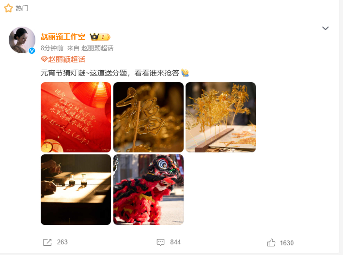 赵丽颖元宵节灯谜赵丽颖元宵灯谜谜底是李秋萍 赵丽颖的元宵灯谜来咯!谜底李秋萍直接亮出来,这分明是给大家送福利,赶紧来抢答,第一个答对的奖励颖宝的甜甜微笑!