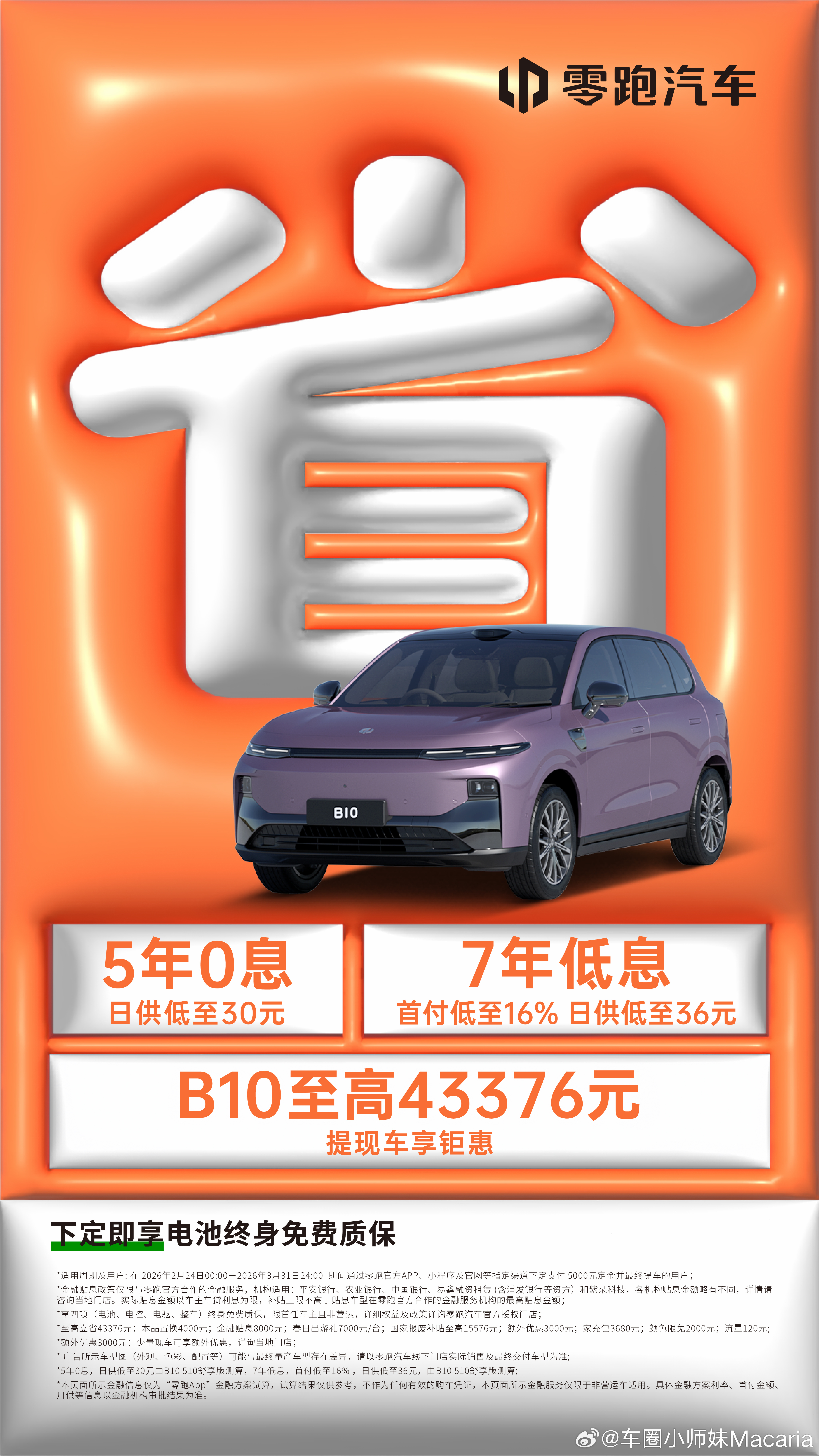 从价格战到金融战,跟大家分享一下零跑开年这波操作哈,以零跑B10为例:现在入手直接送7000元春日出游礼+4000元增换购补贴+8000元金融补贴潮流配色限时免费送,还能+3680元的家充服务包。而且零跑还给了7年低息/5年0息金融政策,首付门槛就比较低,再加上整车+电池终身质保,不会有后顾之忧零跑