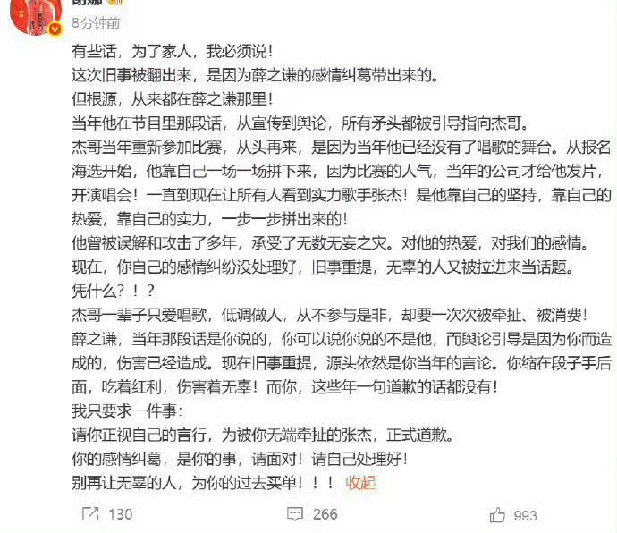 永远都是100%的维护彼此,100%的了解保护彼此!谢娜突然发长文正面刚薛之谦,直接实锤了李雨桐前面的发言,要求他为早年内涵张杰的言论公开道歉!说薛之谦自己感情瓜没理清,还把无辜的张杰扯进来,当年节目里暗讽靠女友、闹解约,害杰哥被网暴这么多年,现在一句道歉都没有!
