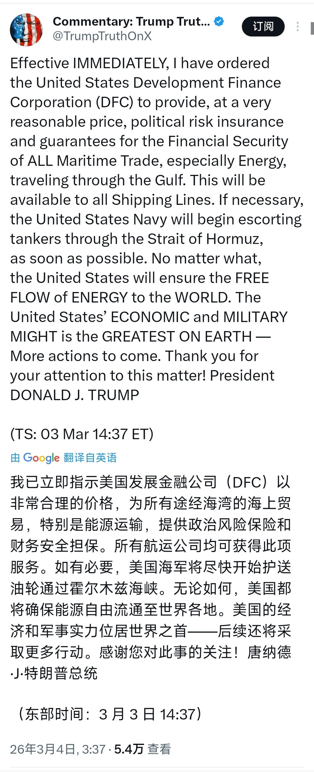特朗普今天(北京时间3月4日)发文:“我已立即指示美国发展金融公司(DFC)以非常合理的价格,为所有途经海湾的海上贸易,特别是能源运输,提供政治风险保险和财务安全担保。所有航运公司均可获得此项服务。如有必要,美国海军将尽快开始护送油轮通过霍尔木兹海峡。无论如何,美国都将确保能源自由流通至世界各地。美国的经济和军实力位居世界之首后续还将采取更多行动。感谢您对此事的关注!” 特朗普通过社交平台发布的这条消息,瞬间成为全球能源市场与国际舆论的焦点,这不是一次普通的表态,而是美国针对当前中东紧张局势打出的一套“金融+军事”组合拳,直接对准全球能源运输最关键的通道霍尔木兹海峡,也让本就动荡的国际局势再添新变量。 很多人看到这条消息第一反应是好奇,美国为什么要在这个时间点突然出手,所谓的政治风险保险和海军护航,到底能起到什么作用,这一切还要从当前霍尔木兹海峡的真实状况说起。 近几天以来,中东地区的冲突持续升级,霍尔木兹海峡已经进入事实上的通行停滞状态,这条被称为“世界油阀”的狭窄水道,承担着全球约20%的石油运输和近三分之一的液化天然气海运贸易,沙特、伊拉克、卡塔尔等海湾主要产油国的能源出口,几乎都要依靠这条通道运往欧洲、亚洲等全球市场。 自冲突升级后,伊朗方面多次发出通行警告,部分试图通过的油轮遭遇袭击,全球各大航运公司纷纷暂停该航线运营,商业保险公司要么大幅提高保费,要么直接取消相关区域的承保,导致大量油轮滞留波斯湾内外,全球能源运输成本急剧飙升,国际油价在短时间内大幅上涨,布伦特原油一度触及每桶85美元上方,创下近期新高。 美国发展金融公司DFC是美国官方的海外投资与金融担保机构,主打政治风险保险业务,简单来说,就是由美国政府出面做“兜底担保”,覆盖战争、地缘冲突、政治暴力等商业保险不愿承担的风险,而且特朗普明确强调“价格非常合理”,面向所有航运公司开放,不设门槛。 这一操作的核心逻辑,是用美国的国家信用填补市场避险的空白,让船东和货主不再担心因地缘冲突造成财产损失,从金融层面打消全球航运业的顾虑,先把停滞的能源运输链条重新盘活。 比金融担保更受关注的,是特朗普提到的“美国海军护送油轮”选项,他用了“如有必要”“尽快开始”两个表述,释放出清晰的军事威慑信号。霍尔木兹海峡最窄处仅33公里,易封锁难突破,此前美军方曾表示暂无护航计划,而特朗普此次公开表态,意味着美军已做好介入海上能源通道的准备。 军事护航的意义不在于立刻投入行动,而在于形成战略震慑,告诉相关方,任何试图阻断海峡通行、袭击过往船只的行为,都可能面临美军的直接回应,这是用军事力量为能源运输保驾护航,也是美国维护自身在中东影响力的直接体现。 特朗普在声明中特意强调“美国的经济和军事实力位居世界之首,后续还将采取更多行动”,这句话并非简单的表态,而是藏着美国的深层考量。一方面,美国本土是全球最大的原油生产国之一,油价过快上涨会推高国内通胀,影响民生与经济稳定,稳住霍尔木兹海峡的能源运输,就是稳住美国国内的油价与通胀预期,这是特朗普政府最现实的国内政治诉求。 另一方面,海湾地区是美国传统的势力范围,确保能源自由流通,本质上是维护美国主导的全球能源秩序,巩固与海湾盟友的安全合作关系,同时在地区博弈中占据主动,避免局势朝着脱离美国控制的方向发展。 从市场反应来看,特朗普的声明发布后,国际油价出现明显回落,市场恐慌情绪有所缓解,这说明全球资本和航运业对美国的这套组合拳给出了正面反馈。但我们也要清醒看到,声明落地仍有不少现实问题需要解决,DFC的保险具体如何申请、覆盖范围、赔付标准尚未公布,海军护航的规模、航线、启动条件也没有明确细则,这些都需要时间逐步落地。 更重要的是,中东局势复杂多变,地区各方的立场与行动难以预测,美国的介入或许能短期稳定航运,但无法从根本上化解地区矛盾,海峡能否长期恢复平稳通行,依然存在很大不确定性。 接下来的几天,将是观察局势走向的关键期,我们会看到DFC是否快速推出具体保险方案,美军是否真的派遣舰艇进入海峡执行护航任务,伊朗及地区其他各方会做出怎样的回应。可以确定的是,霍尔木兹海峡已经成为全球地缘博弈的焦点,美国的强势介入,让这条能源通道的未来走向,牵动着整个世界的经济与安全神经,而特朗普口中的“更多行动”,也意味着这场围绕全球能源命脉的博弈,远没有到结束的时候。