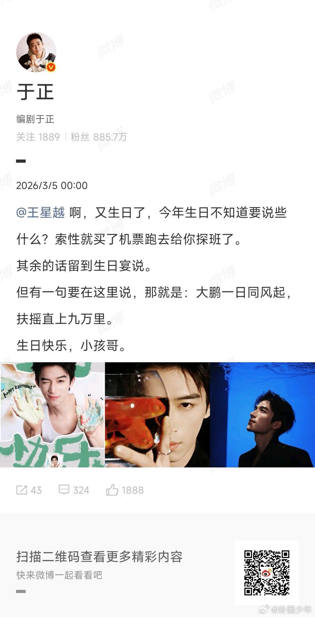 于正为许凯和王星越庆生 同天生日,双倍美好。欢娱的温暖从不缺席,愿许凯、王星越新岁顺遂,在热爱的世界里闪闪发光,好戏不停,光芒不减。