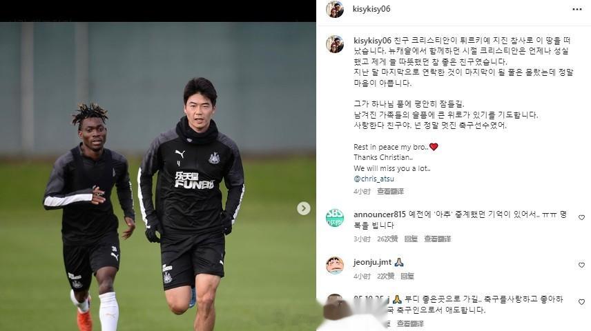 【奇诚庸悼念纽卡斯尔联时期队友阿特苏,“上个月的最后一次联络竟成诀别”】