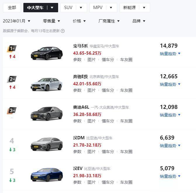 1月销量破万的中大型轿车,有3款!在1月中大型轿车销量排行榜当中,有24款车型有销量数据,销量破万的车型有3款:12098辆的奥迪A6L、12665辆的奔驰E级以及14879辆的宝马5系;但是值得一提的是,比亚迪汉将EV车型和DM混动车型进行了拆分,EV纯电车型是5079辆,DM混动车型是6639辆!