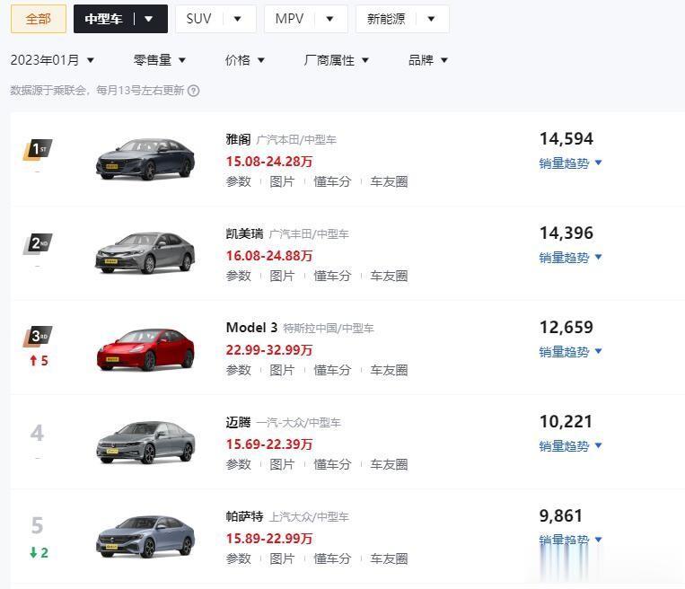 仅有4款车型破万,1月中型车销量遭遇寒流!相比前几个月十款左右的破万车型,1月份的中型车市场,和整个大环境一样,遭遇了寒流;10221辆的大众迈腾、12659辆的特斯拉Model Y、14396辆的丰田凯美瑞以及14594辆的本田雅阁,分别榜单的第四到第一名!