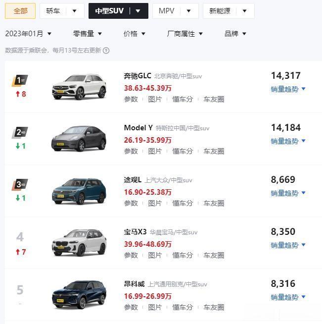 1月中型SUV只有2款车型!1月中型SUV有82款车型有销量数据,其中销量破万的车型只有2款,分别是14184辆的特斯拉Model Y和14317辆的奔驰GLC;虽然只有两款车型破万,但是这两款车型的销量却不相上下,只有133辆的差距,竞争十分激烈!
