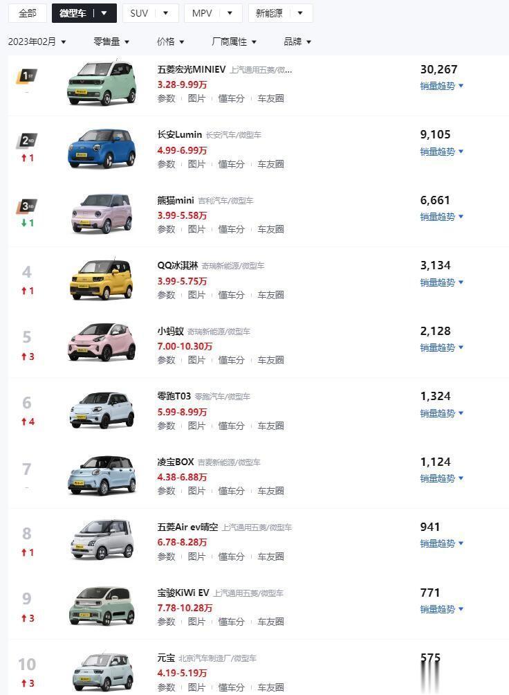30267辆!这款小车实现了““一打所有”!在2月紧凑型车销量排行榜上,五菱宏光MINIEV创造了一个不大不小的纪录,那就是“一打所有”;本期榜单从第二名9105辆的长安Lumin开始,一直到倒数第一名16辆的科莱威CLEVER,这18款车型的销量之和只有27608辆,连3万辆都没到;18款车型加起来没有五菱宏光MINIEV一款车型高,真的实现了“一打所有”!