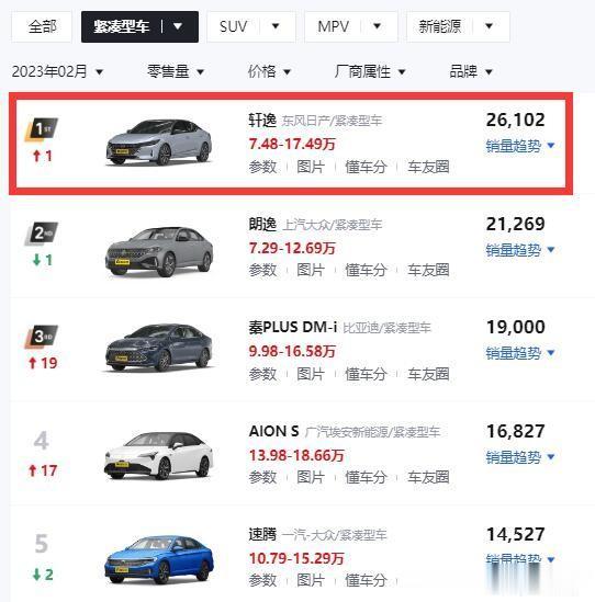 26102辆!日产轩逸“白捡”了个冠军!日产轩逸的2月销量达到了26102辆,本来与冠军无缘,但是却“白捡”了个冠军,原因是比亚迪秦“弃权”了,比亚迪秦拆分成了三款车型:秦PLUS DM-i、秦PLUS EV以及秦EV,销量最高的秦PLUS DM-i仅仅是19000辆;30540辆的冠军成绩被拆成了三份,放弃了冠军争夺,日产轩逸渔翁得利,“白捡”了个冠军!