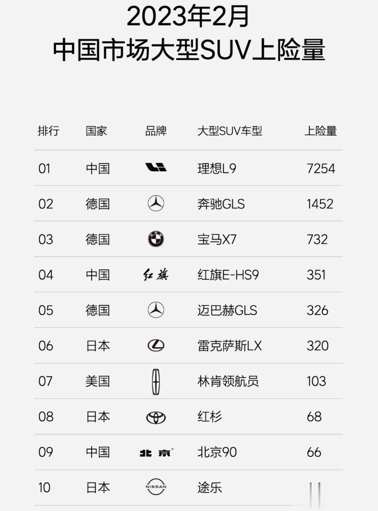 7254辆!理想L9拿到2月大型SUV上 险 量冠军!理想汽车出手就是王炸,大型SUV理想L9上市不久,就稳居大型SUV冠军,2月上险量高达7254辆,比第二名到第十名的上险量之和还要多很多;第二名是1452辆的奔驰GLS、第三名宝马X7仅仅是732辆!
