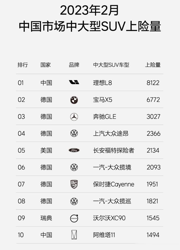 8122辆!理想L8拿到2月中大型SUV上 险 量冠军!根据中汽数据解读,月中大型SUV上险量排行榜当中,上险量超过2000辆的车型有6款,但是超过6000辆的车型只有两款,分别是6772辆的宝马X5以及冠军8122辆的理想L8、第三名是3027辆的奔驰GLE;理想L8力压宝马和奔驰拿到冠军,强劲的实力不容小觑!
