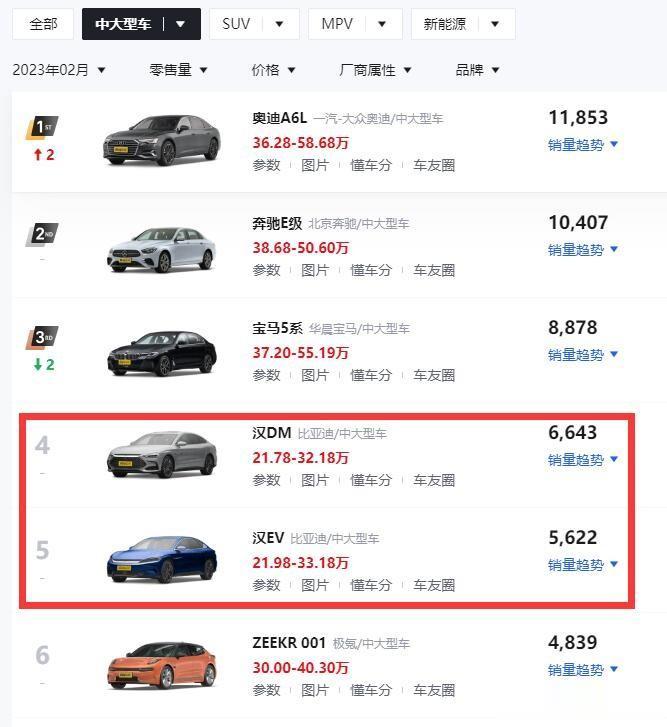 12265辆!到手的冠军飞走了,比亚迪汉找谁讲理去!在2月中大型轿车销量排行榜当中,冠军是11853辆的奥迪A6L、亚军是10407辆的奔驰E级;可是尴尬的问题出现了,比亚迪汉被拆分成了2款车型,分别是6643辆的汉DM、和5622辆的汉EV;要是这两款车型加起来计算的话,12265辆的成绩,稳超11853辆的奥迪A6L;到手的冠军飞走了,比亚迪汉找谁讲理去!