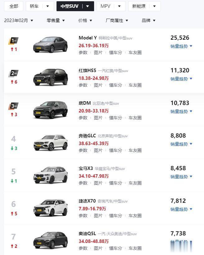 25526辆!特斯拉Model Y居然又是冠军!在2月中型SUV销量排行榜上,销量破万的车型有3款,分别是10783辆的比亚迪唐DM、11320辆的红旗HS5,以及26626辆的特斯拉Model Y;特斯拉Model Y居然又是冠军,这也许出乎很多车主的意料之外,但是特斯拉的销量就是这么坚挺、不服不行!
