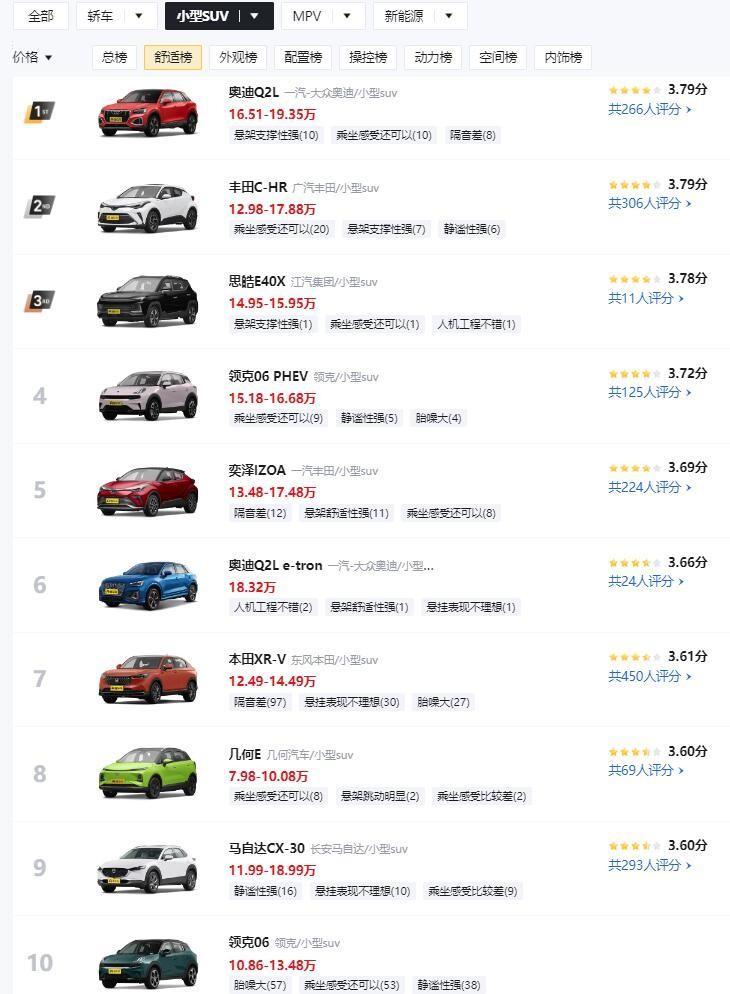 3.79分!小型SUV舒适度排行榜出炉!奥迪Q2L和丰田C-HR的舒适度得分都是3.79分,力压7.38分的思皓E40X排在并列第一名;对于奥迪Q2L和丰田C-HR来讲,悬架支撑性强、乘坐感受还可以、静谧性强以及方向盘握感好,都是车主对其最中肯的评价。