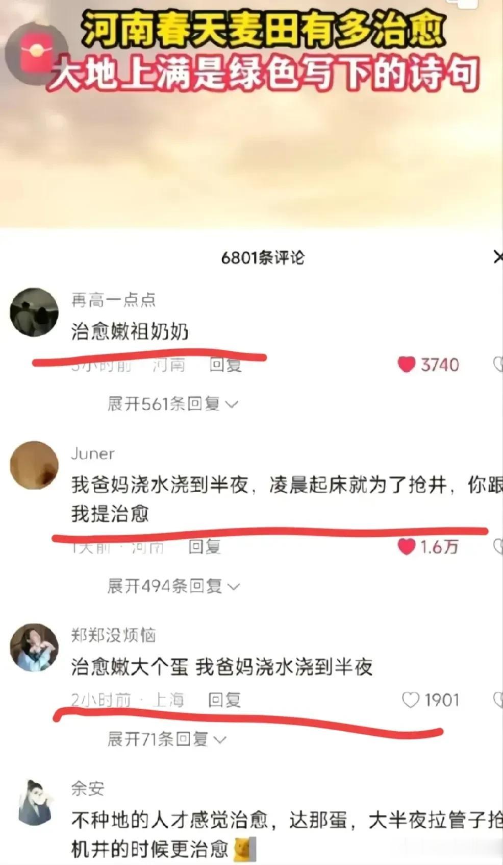 河南日报拍摄发布的一个河南春天麦田有多治愈的短视频,评论区一片骂声,结果翻车了。 遍身罗绮者,十指不沾泥的人哪里知道农户种小麦的辛酸,在他们眼里是诗和远方,在劳动人民眼里只有黄土和汗水。希望多到民间体验一下种地人的劳苦,而不是感受春天的希望和浪漫。