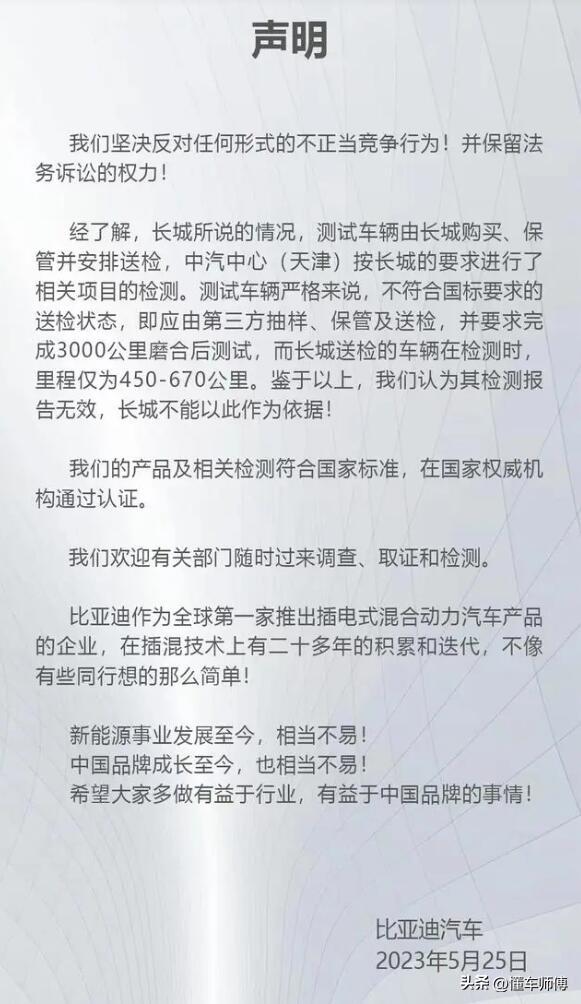 坚决反对任何形式的不正当竞争行为!面对长城汽车举报,比亚迪的反击来了!在长城汽车的举报材料中,指出了比亚迪秦PLUS DM-i和宋PLUS DM-i,涉嫌整车蒸发污染物排放不达标的问题。但是比亚迪随即发表声明,声明中指出了检测的漏洞,那就是应该由第三方抽样、保管及送检,并要求完成3000公里磨合后测试;而长城汽车送检的车辆是长城自己购买、保管并送检的,并且行驶里程仅仅在450到670公里;所以说检测报告无效,长城汽车不能作为投诉的依据!声明当中,比亚迪坚决反对任何形式的不正当竞争行为,毕竟新能源事业发展至今,相当不易;国产品牌成长至今,更是相当不易!